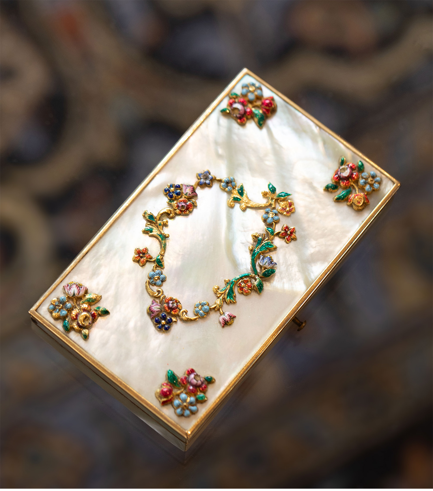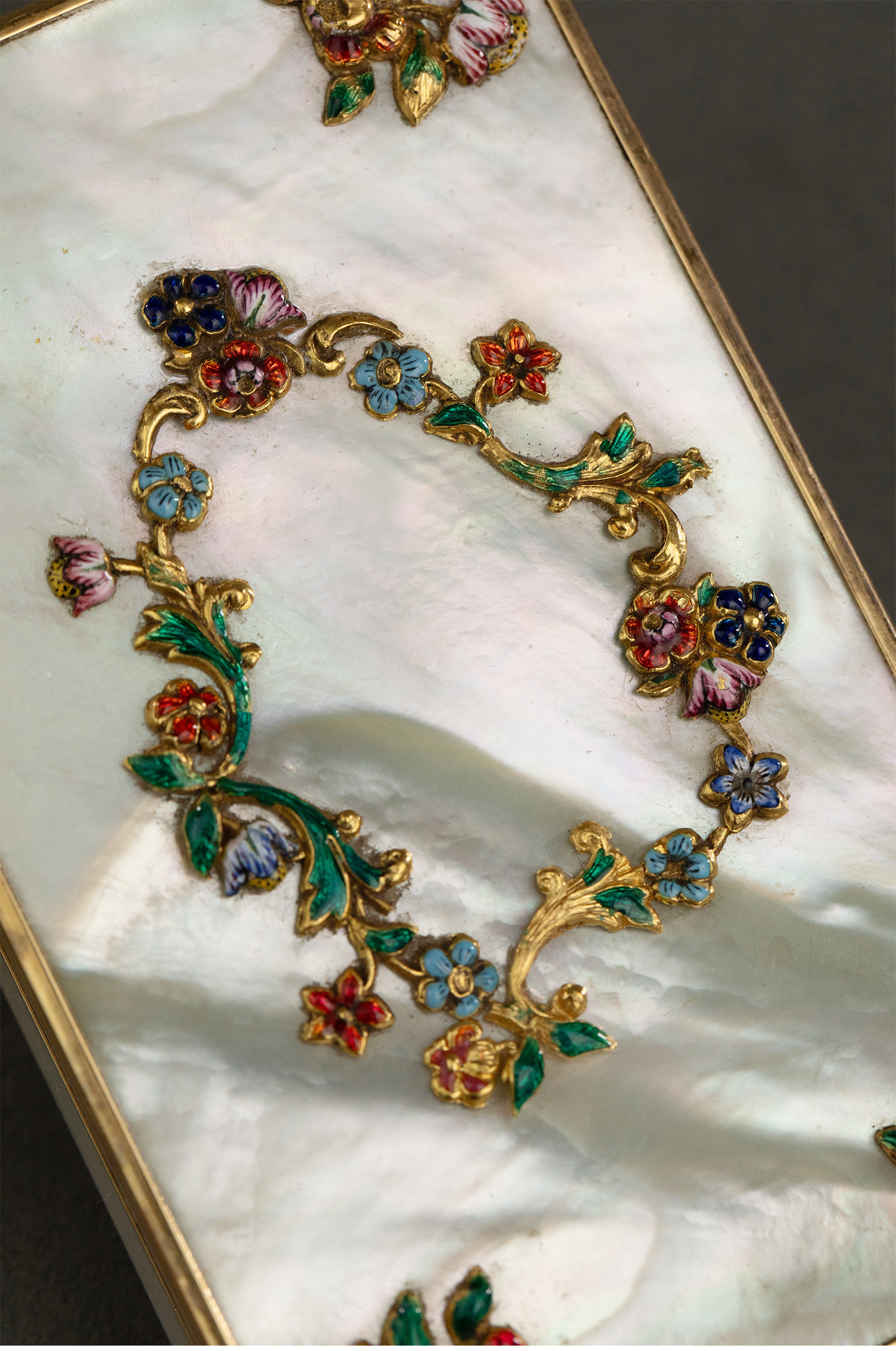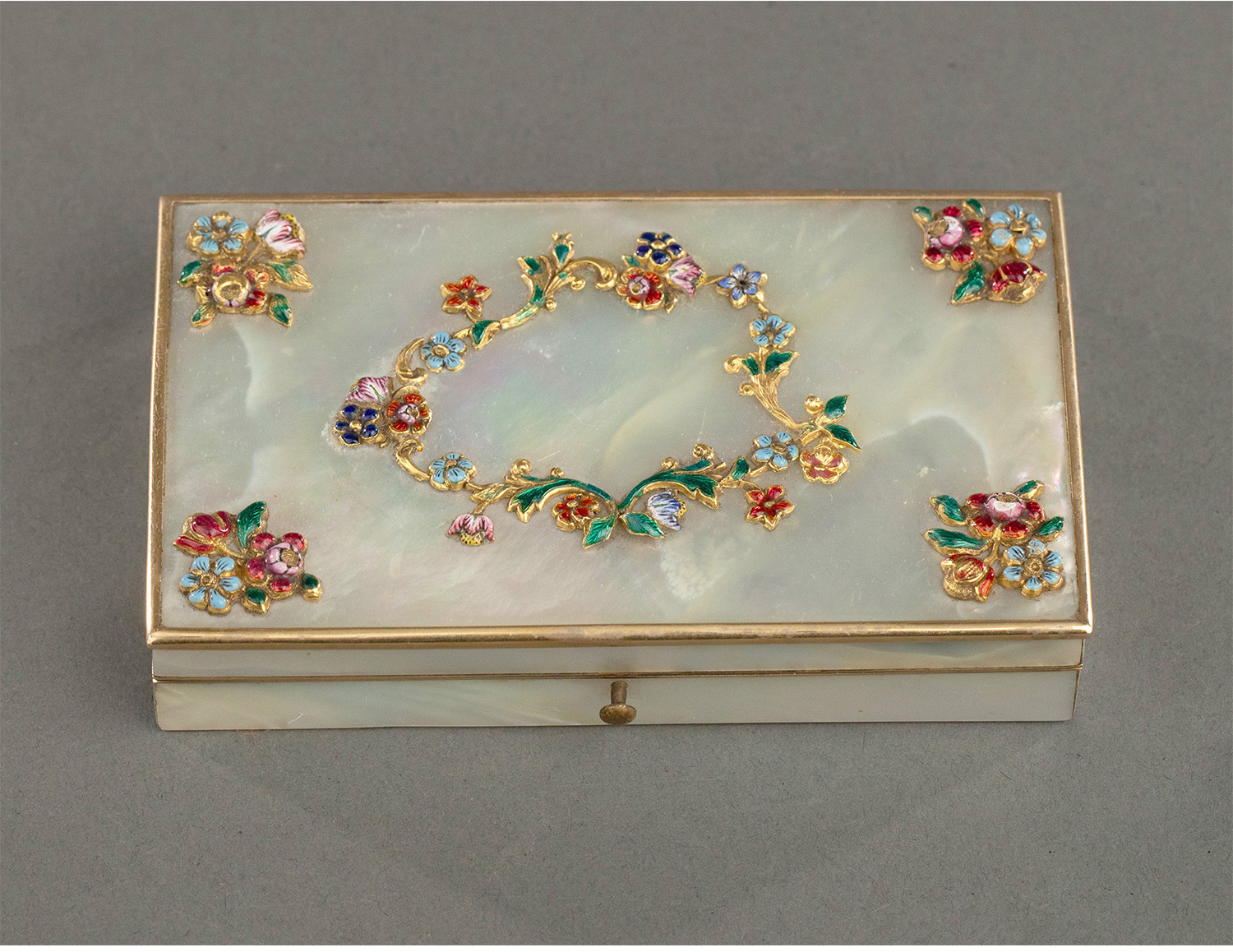 材质:14K黄金(盒身),18K黄金(工具),母贝,珐琅,钢