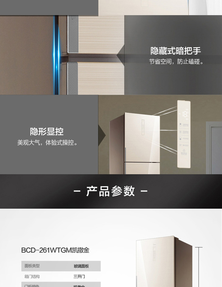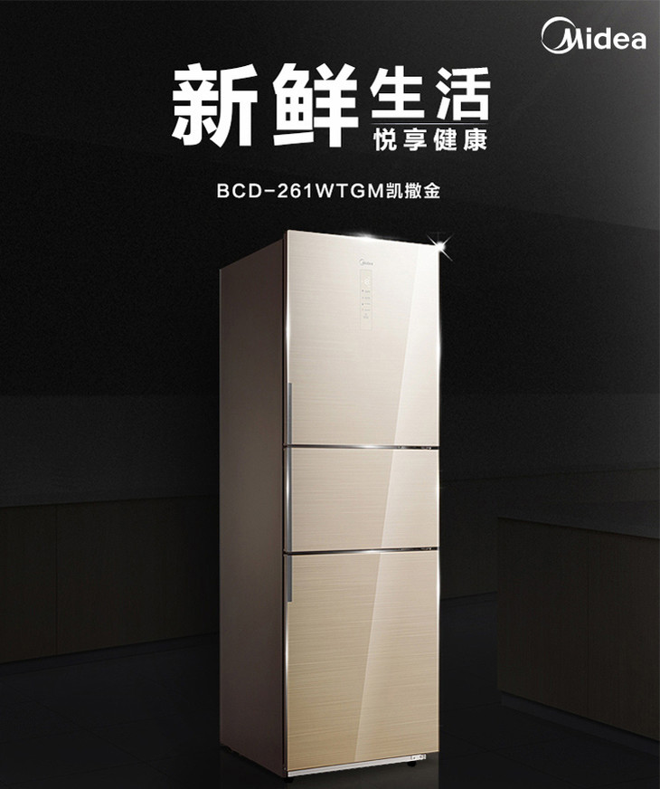 美的(Midea)BCD-261WTGM 三门家用节能冰箱 玻璃面板 铂金净味 中门变温凯撒金