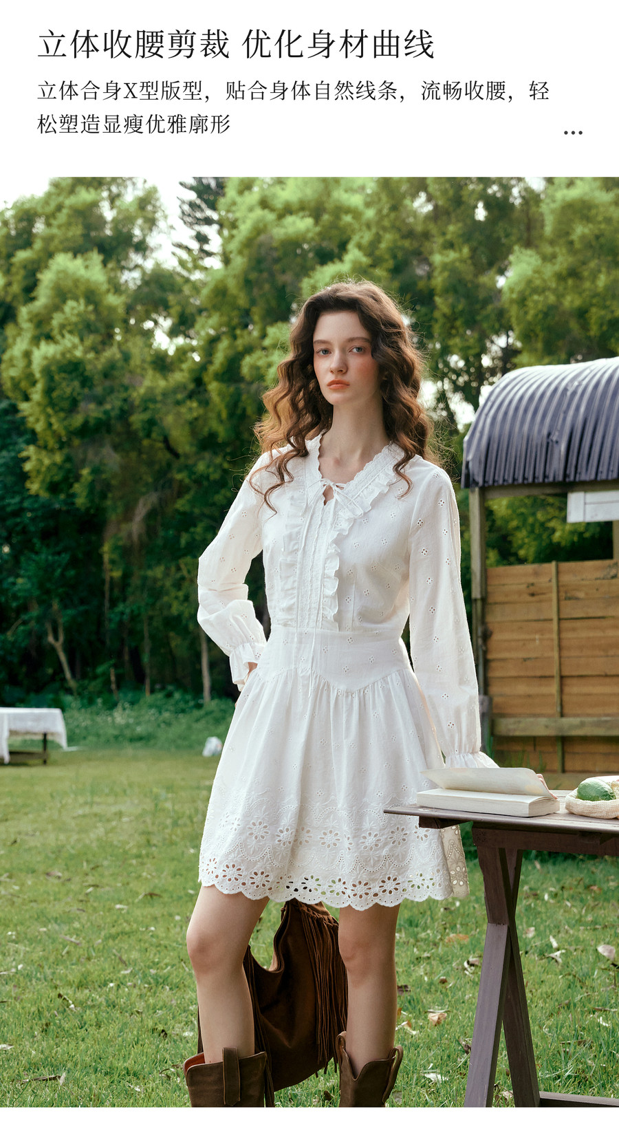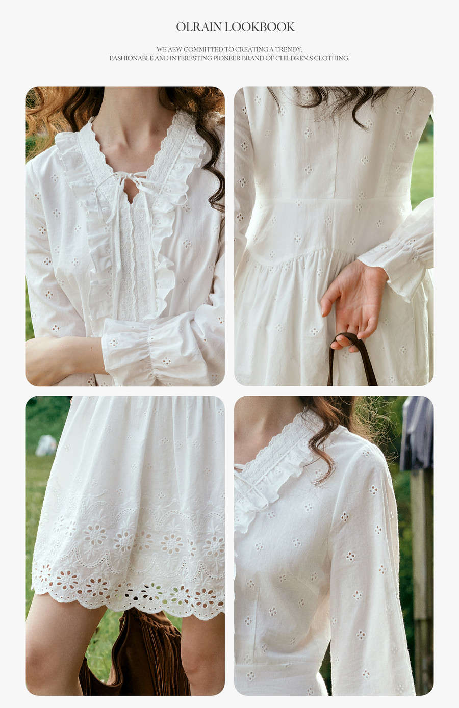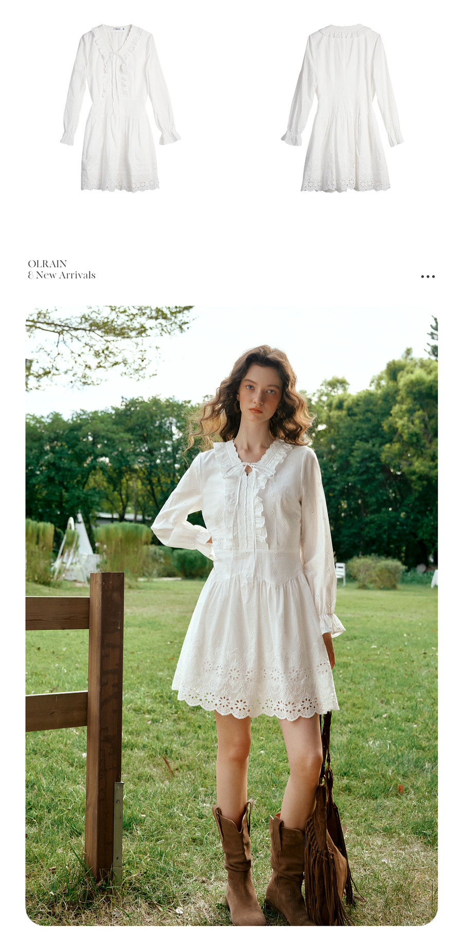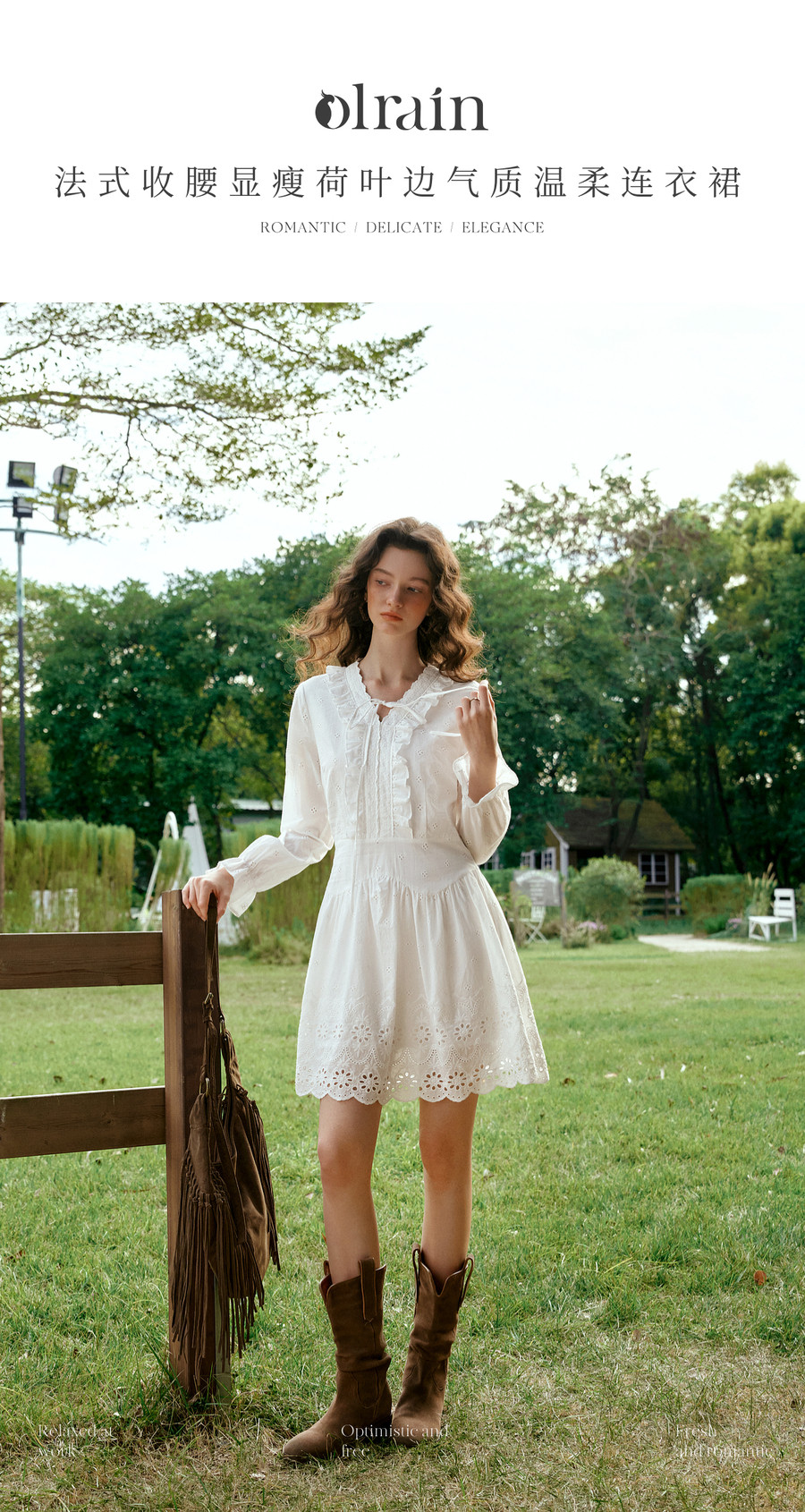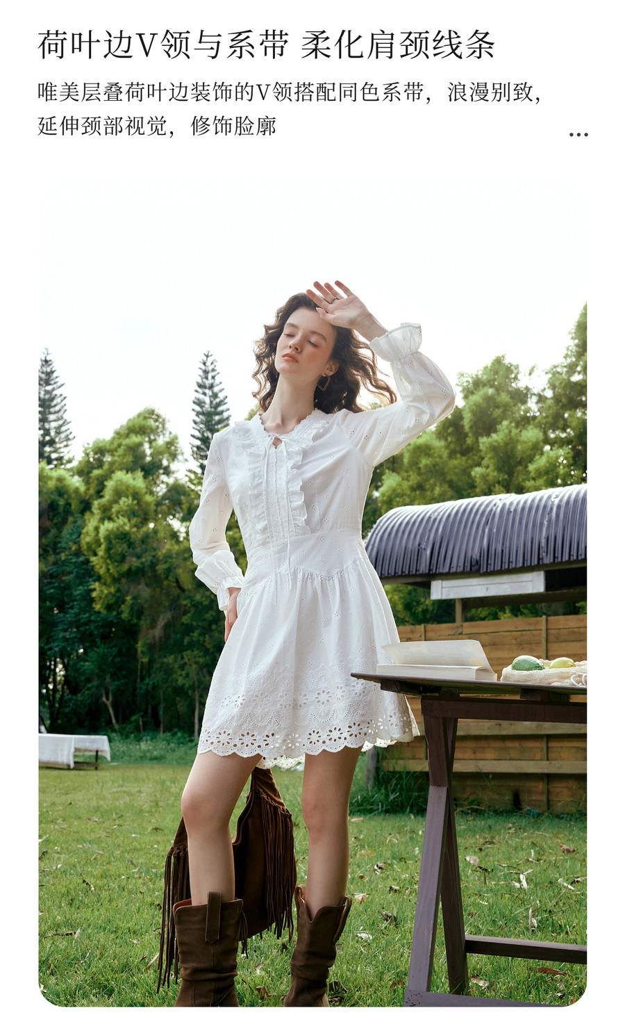 欧芮儿法式荷叶边V领长袖连衣裙女春季2026新款裙摆镂空绣花A字裙