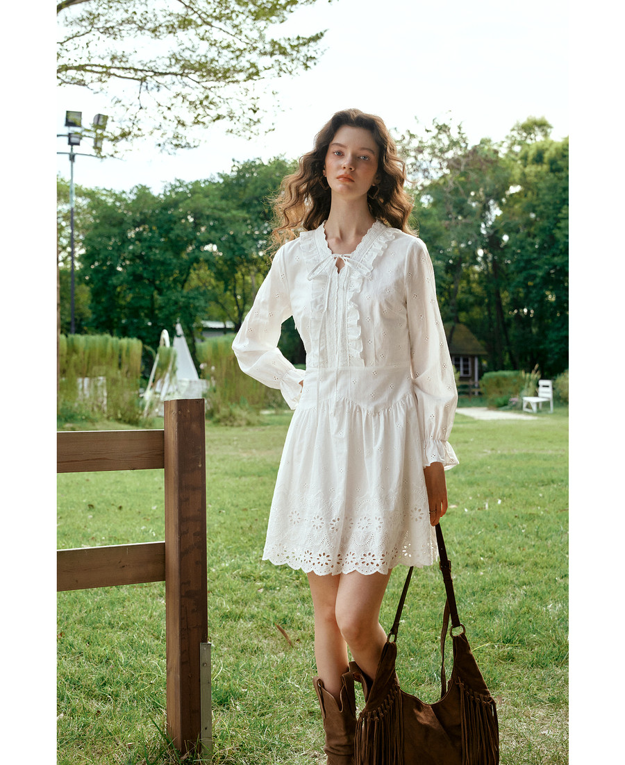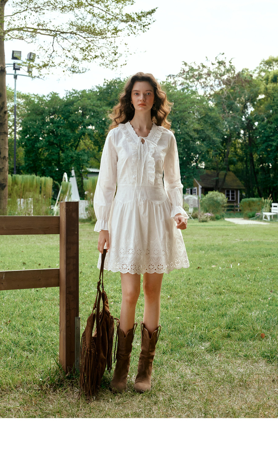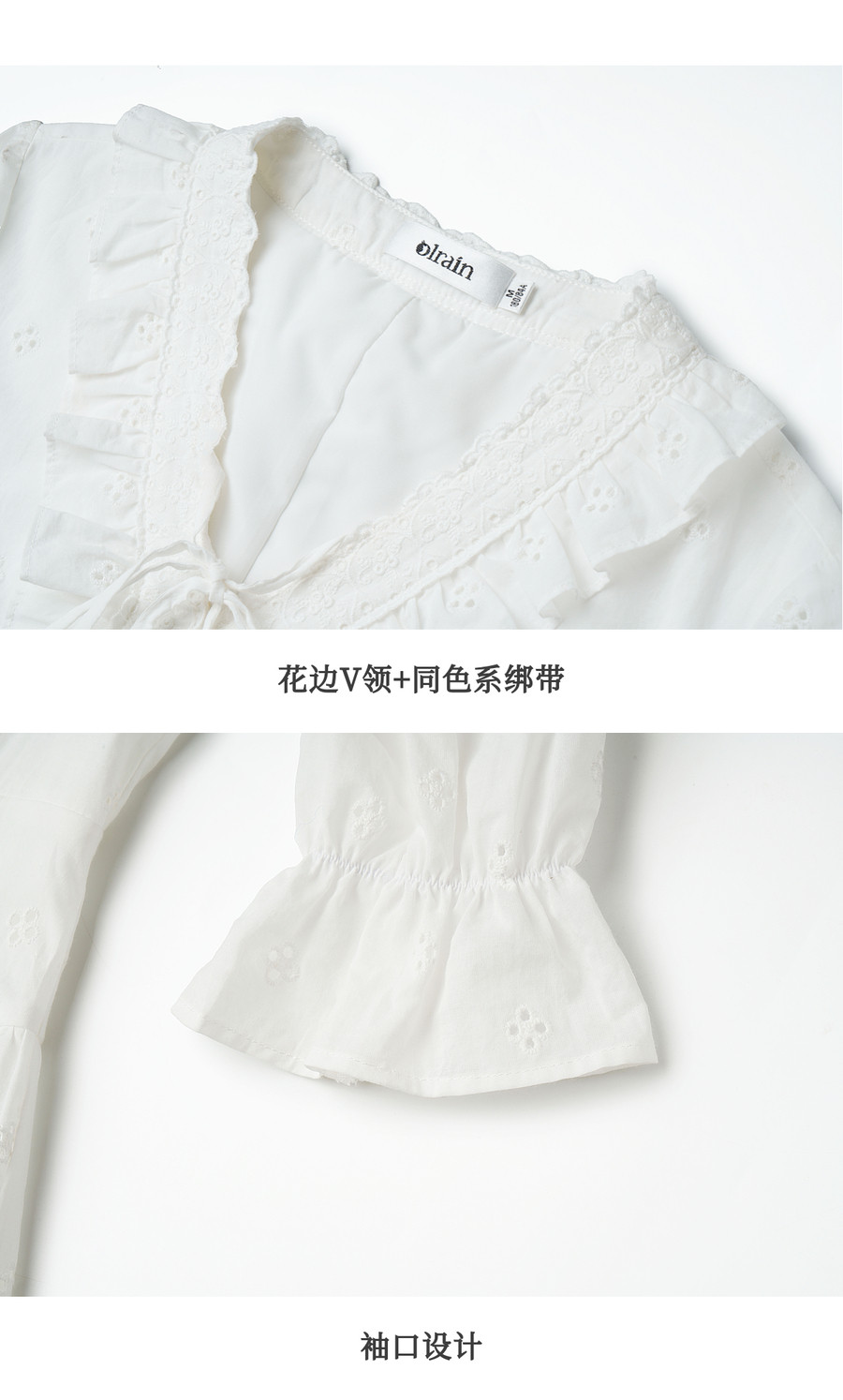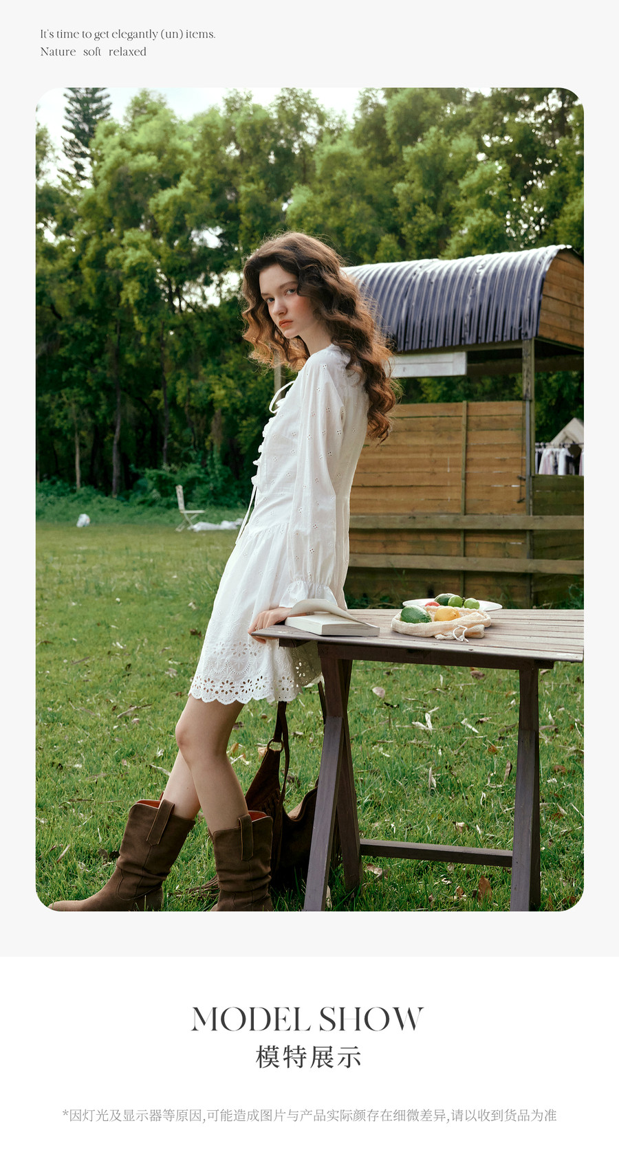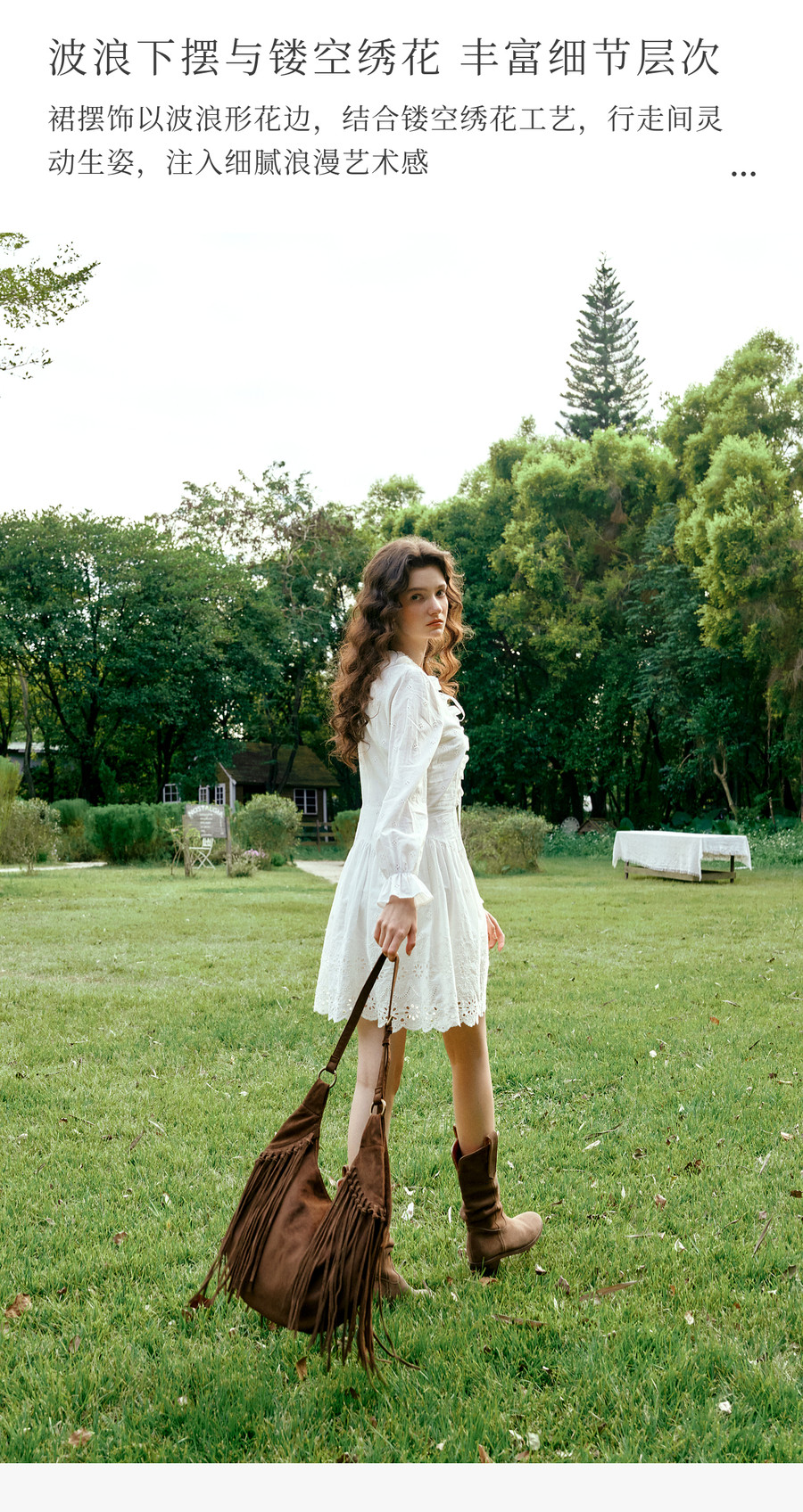 欧芮儿法式荷叶边V领长袖连衣裙女春季2026新款裙摆镂空绣花A字裙