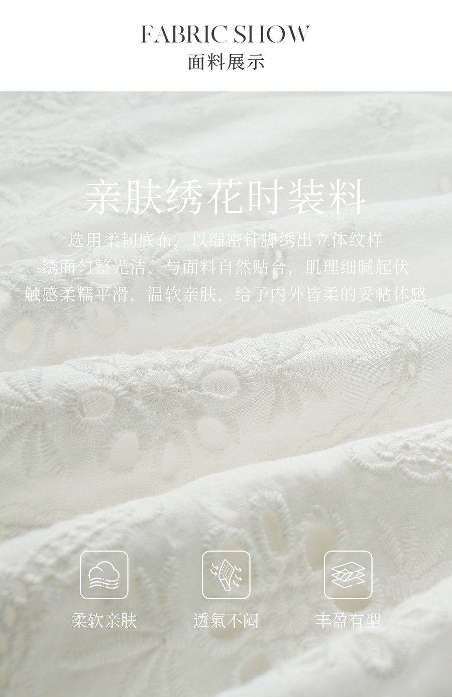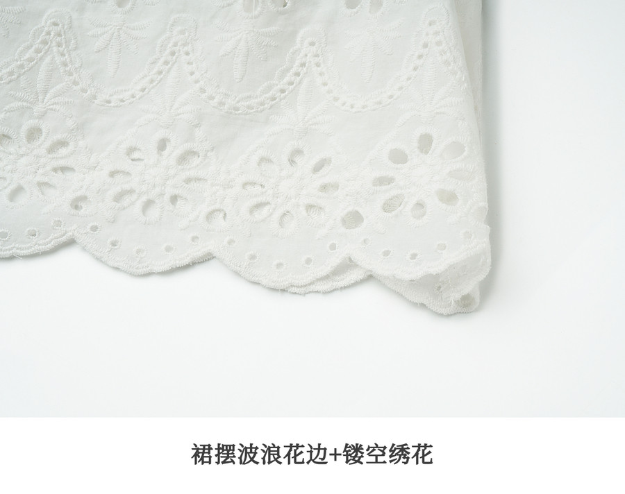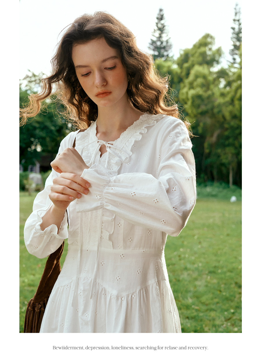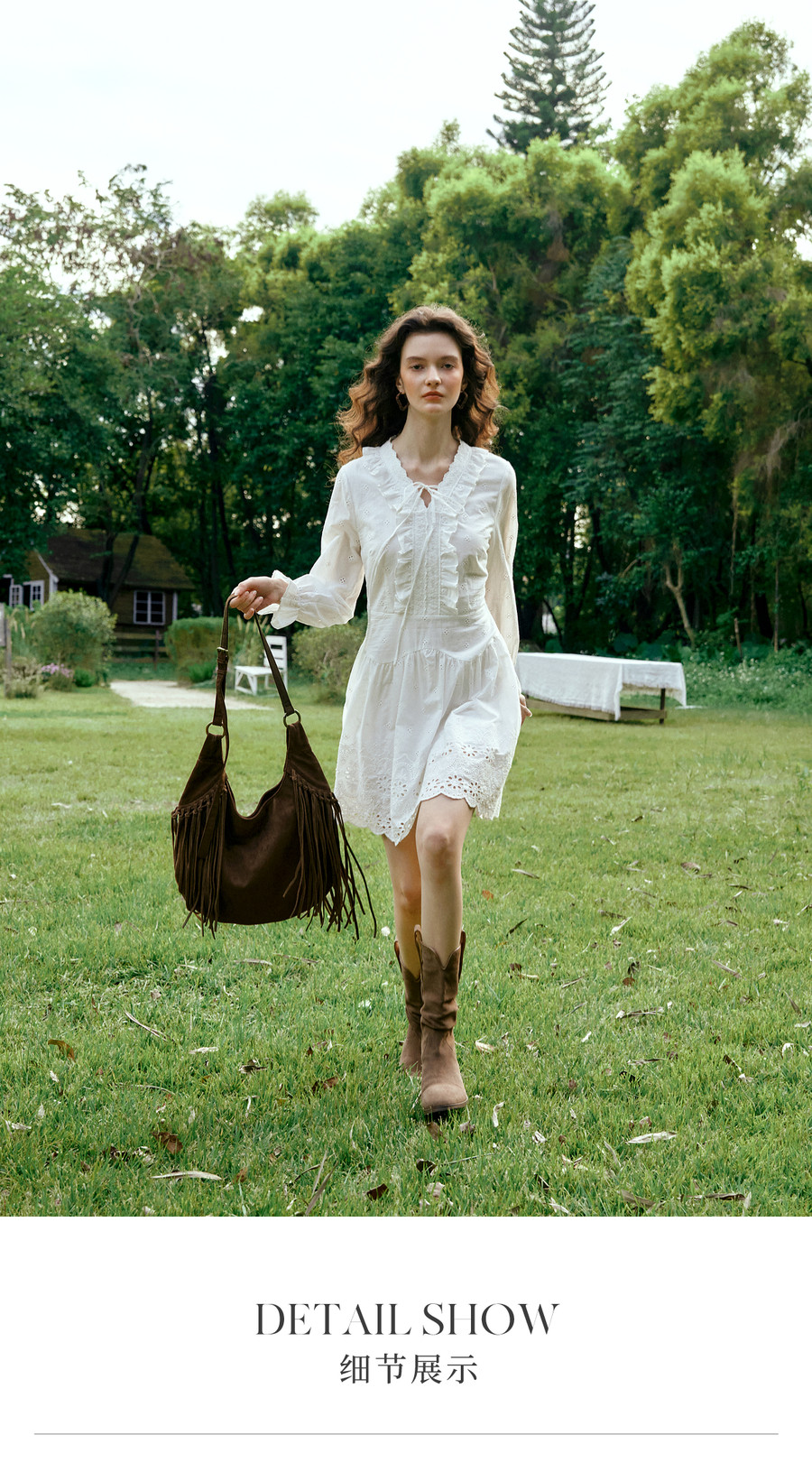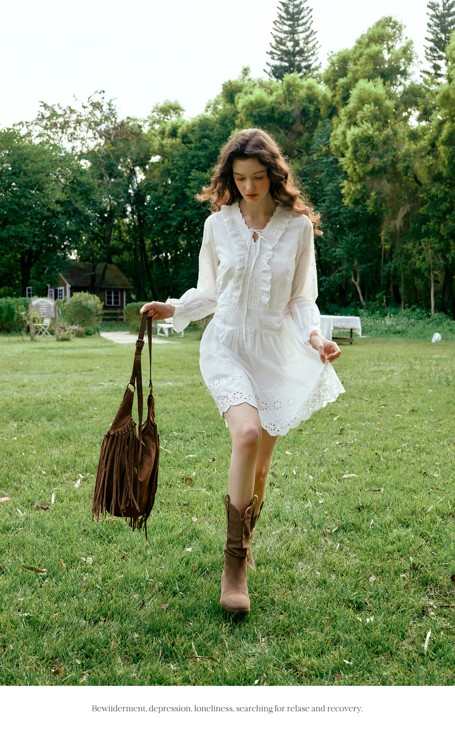 欧芮儿法式荷叶边V领长袖连衣裙女春季2026新款裙摆镂空绣花A字裙