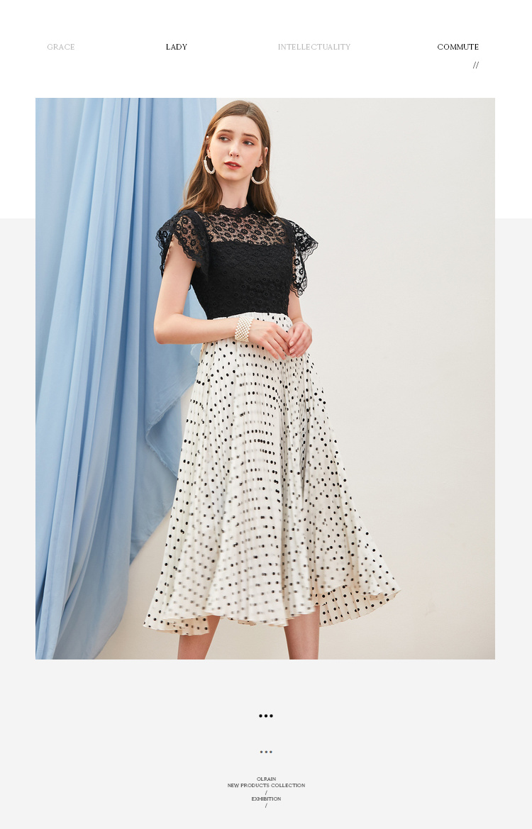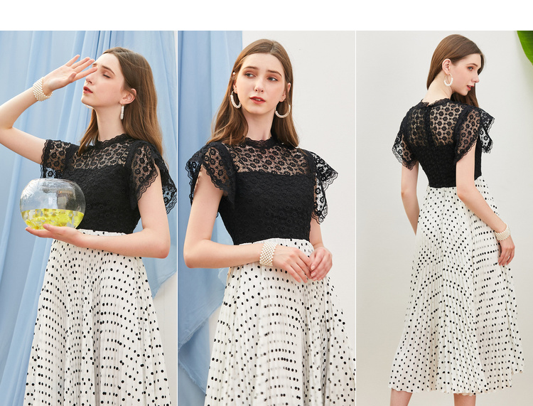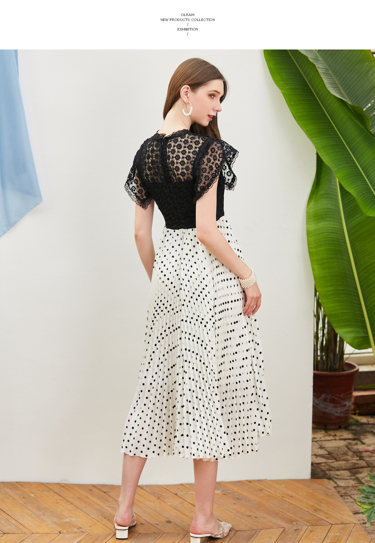 欧芮儿夏装2019新款女装蕾丝拼接连衣裙中长款气质波点百褶女裙