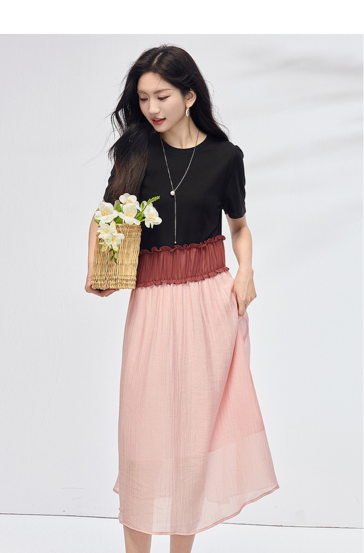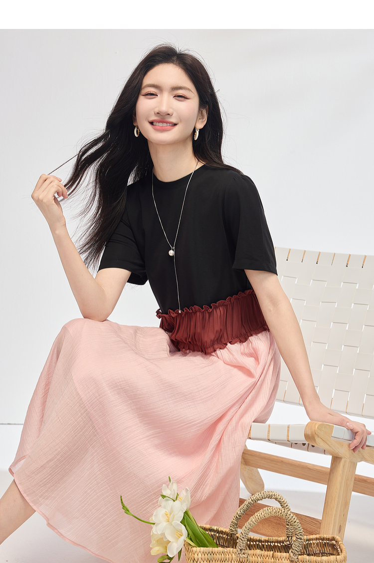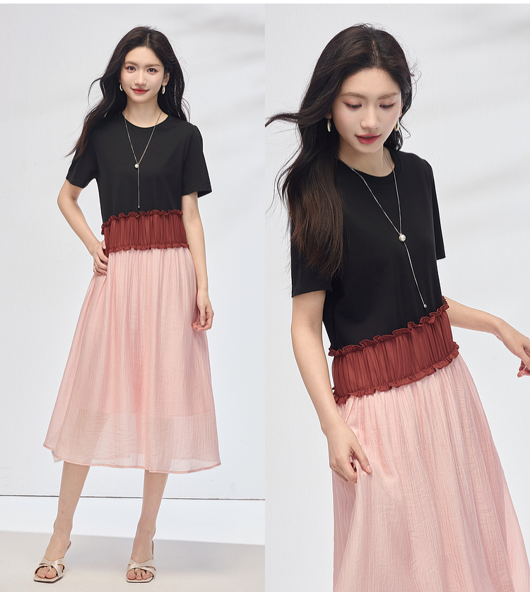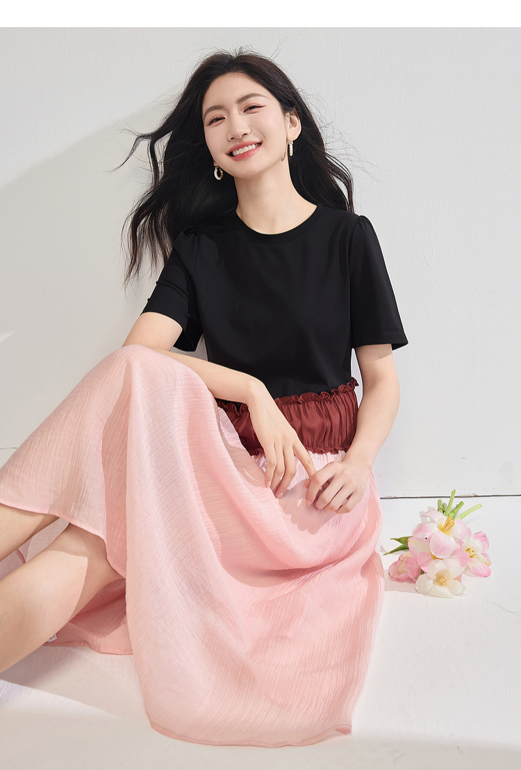 【专属特价】熙世界设计感撞色收腰连衣裙女假两件短袖T恤拼接裙子2025夏新款