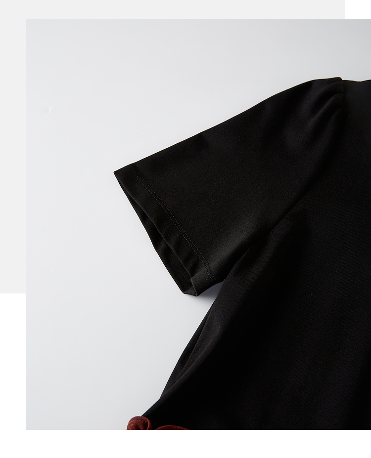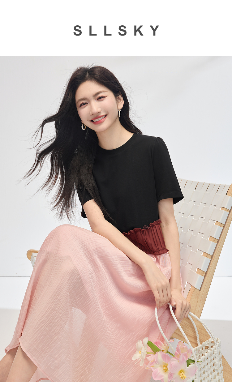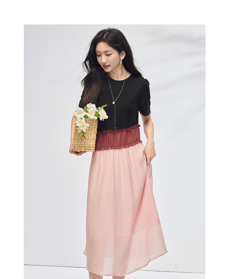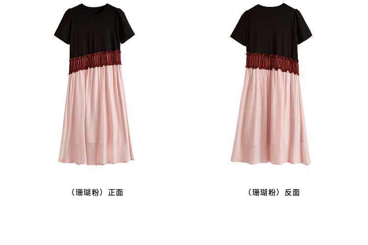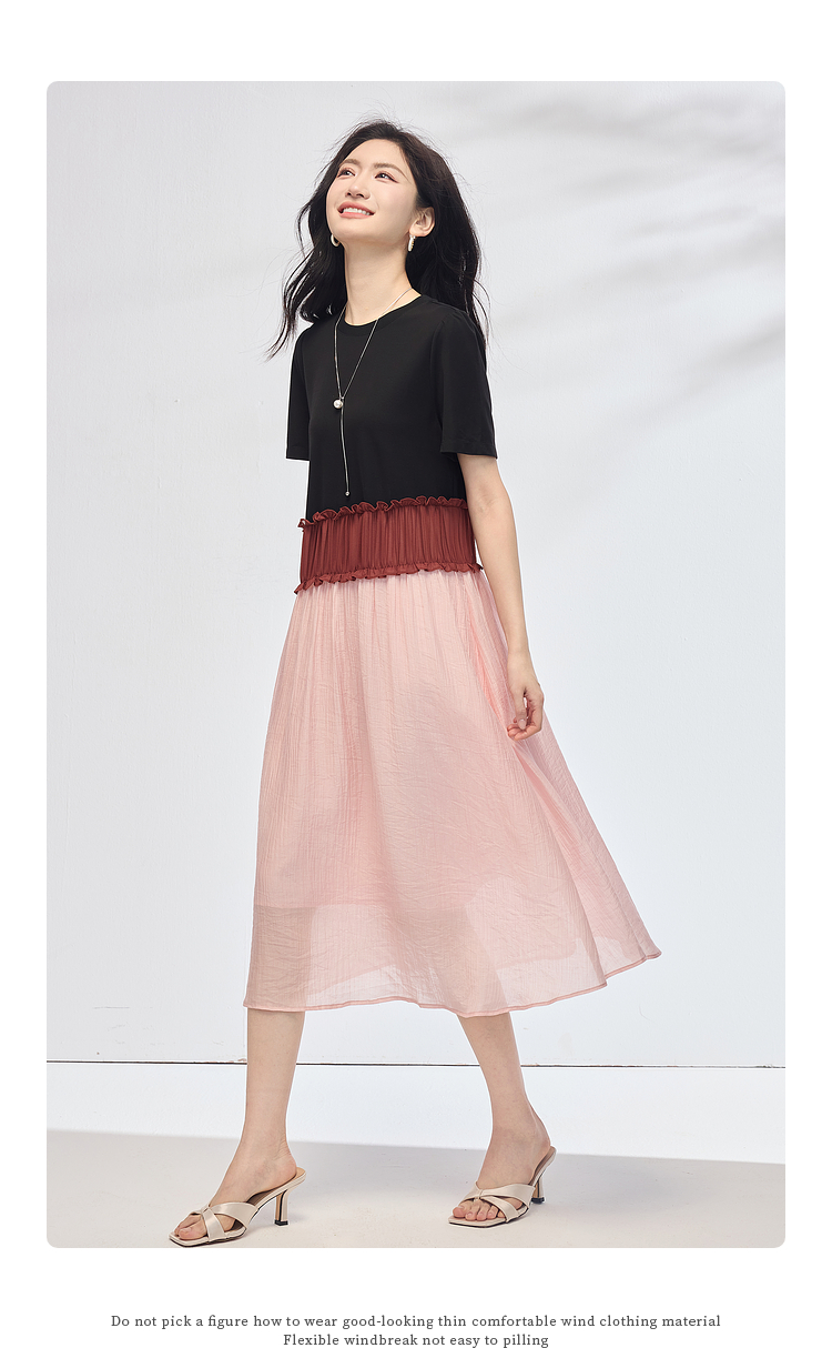【专属特价】熙世界设计感撞色收腰连衣裙女假两件短袖T恤拼接裙子2025夏新款