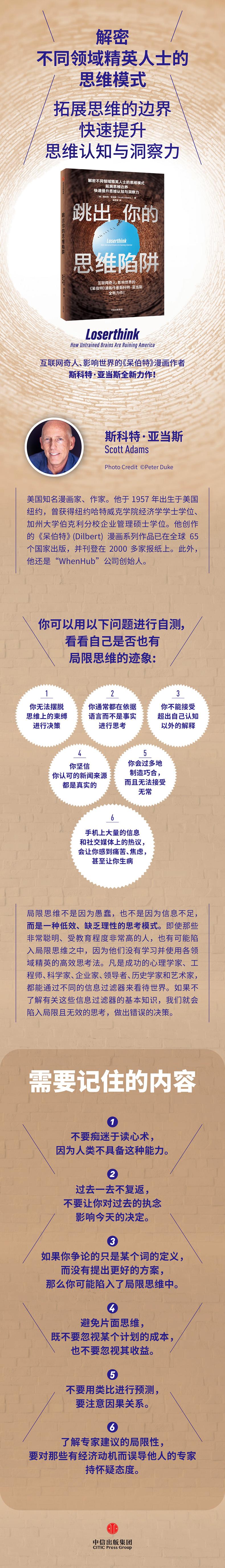 我们知道,思维决定行动,行动决定你的成败。 每个人每时每刻在使用自己的大脑,但很多人并未学会如何理性有效地思考。从小到大,没人教给我们如何正确思考,每个人因其成长环境及背景,拥有属于自己的特定的思维模式。 如果你目前频繁使用网络以及相关社交平台,那么你会在海量信息的轰炸下产生很多荒谬且徒劳的推理,比如:“我能推断出你在想什么”“我的想法必然是正确的”“你肯定是错误的”……你难免会受到他人言论的误导,被自己的思维定式所干扰。 风靡全球的职场漫画“呆伯特系列”的作者斯科特·亚当斯对这些形形色色的思维现象进行了研究,在他看来,当下我们中有很多人掉进了被他称为“局限思维”(Loserthink)的陷阱中,我们会自以为是、是非不分、以偏概全……在这种思维模式下,我们被各种幻想和徒劳无益的思维所束缚,不仅缺乏认识世界、理性行事的能力,还因此做出了很多错误的决策。 局限思维让我们偏激,让我们低效,让我们愚蠢,也让我们丧失了清醒思考的能力。斯科特建议读者,通过系统的思维训练,让自己习得心理学家、艺术家、历史学家、工程师、领导者、科学家、企业家、经济学家的思考技巧,谨慎甄别所谓的“专家”之言,学会在任何问题面前保持清醒理性的思考,这样才有能力跳出危险的思维陷阱,做出更高效更睿智的决策。