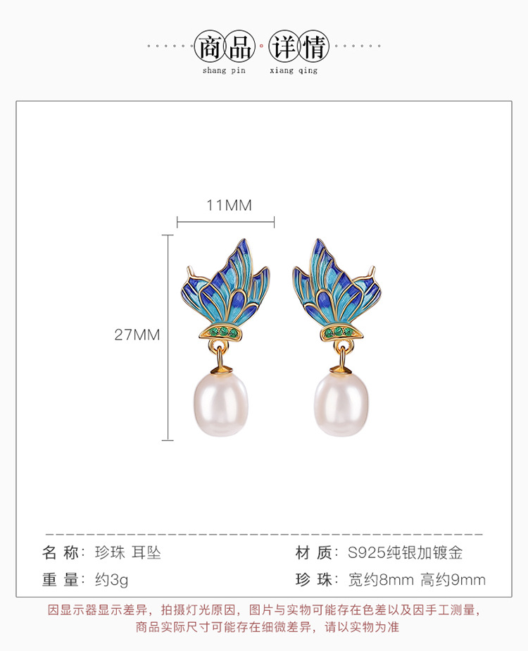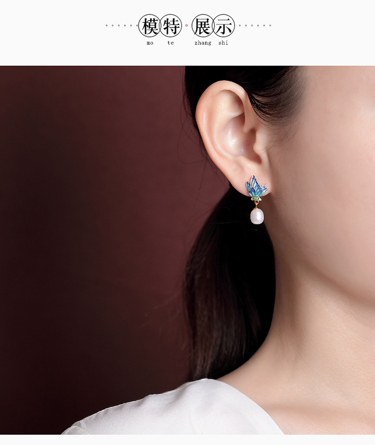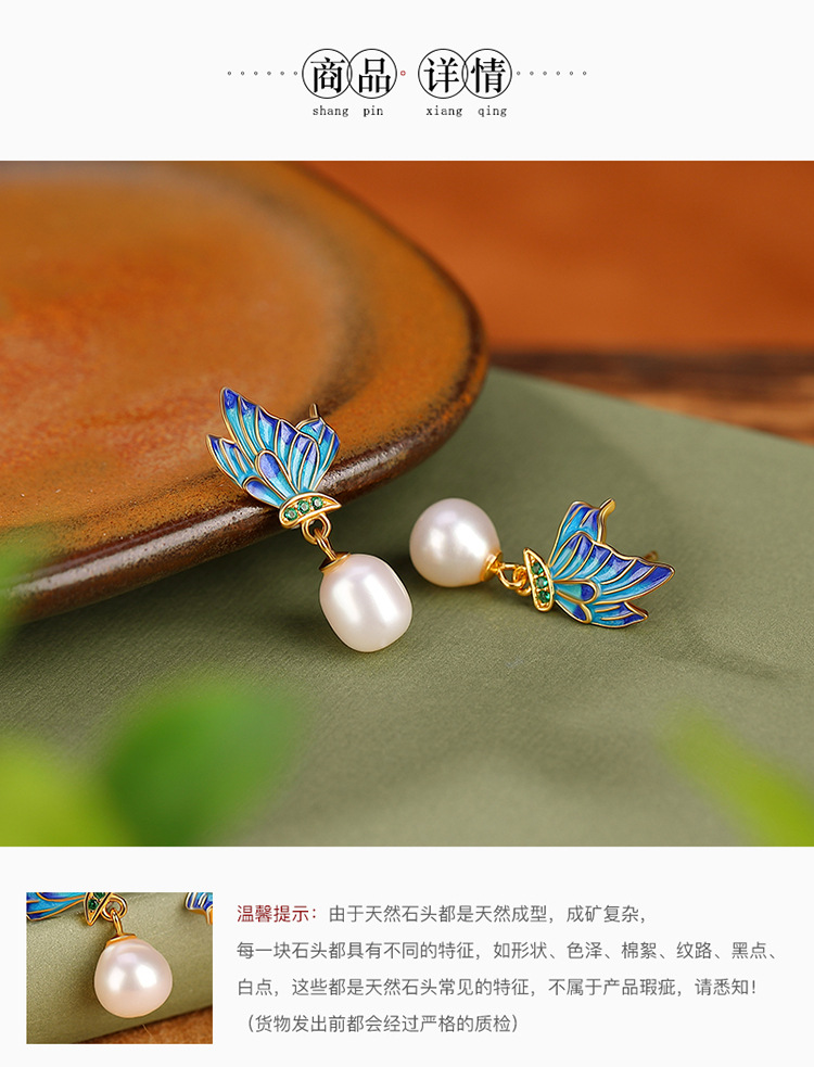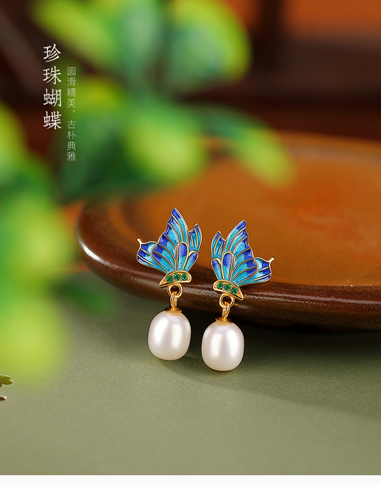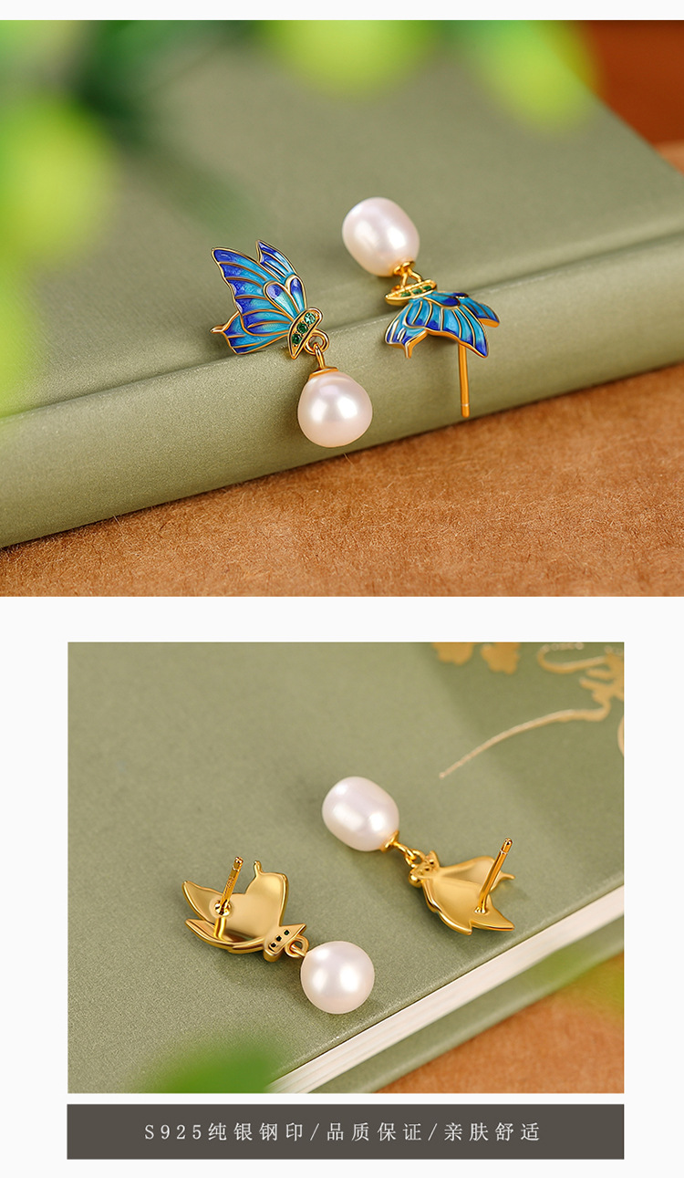 【春归蝴蝶】S925银镀金淡水珍珠国潮珐琅蝴蝶不规则耳饰【CW-ED02955】