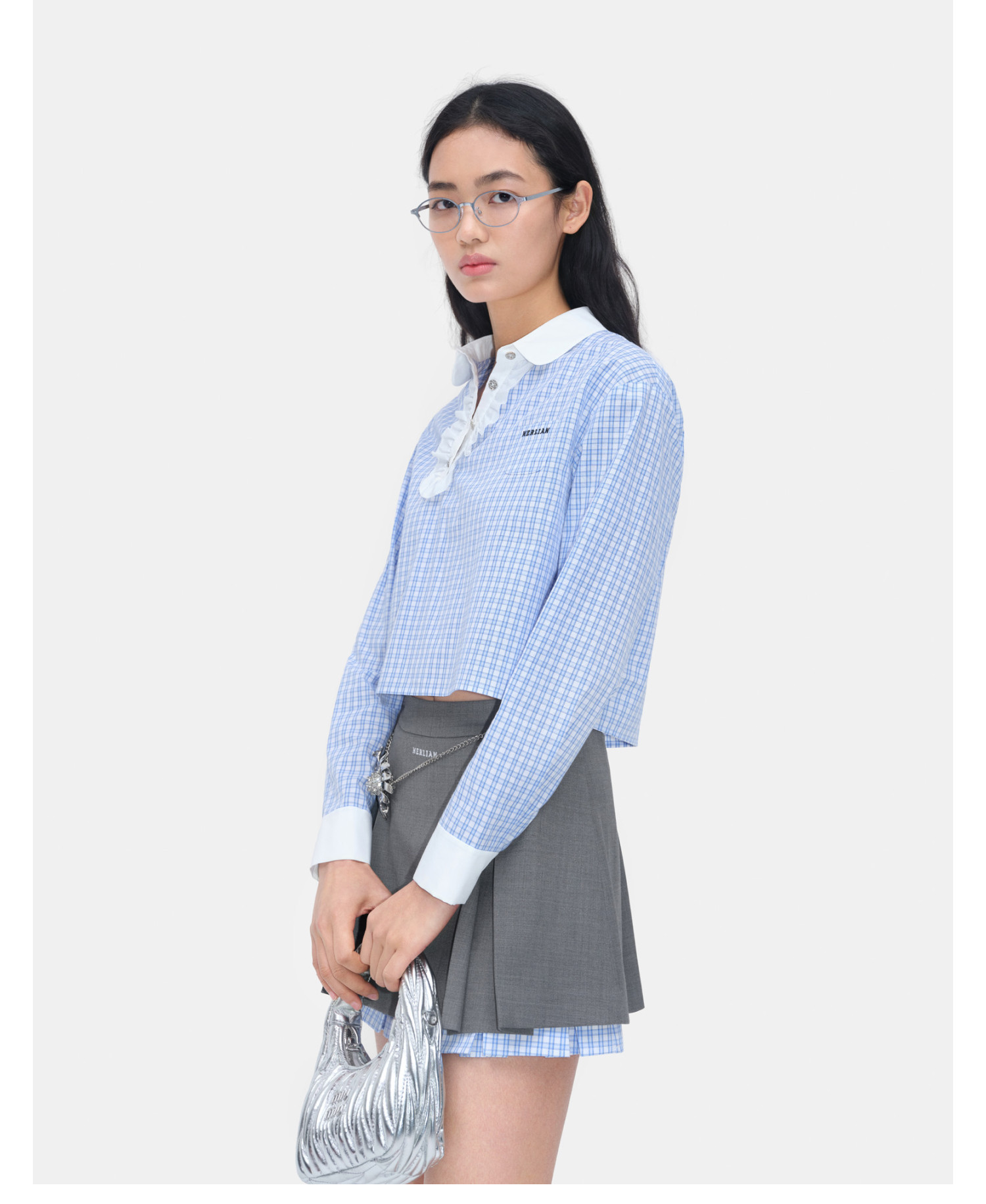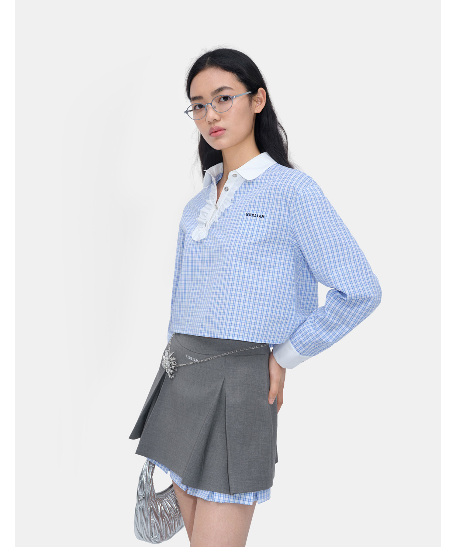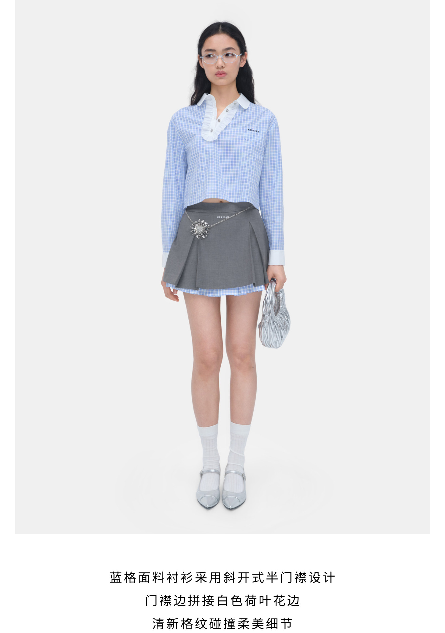 HERLIAN 2026年春季新品荷叶花边斜襟蓝格女士长袖宽松显瘦衬衫