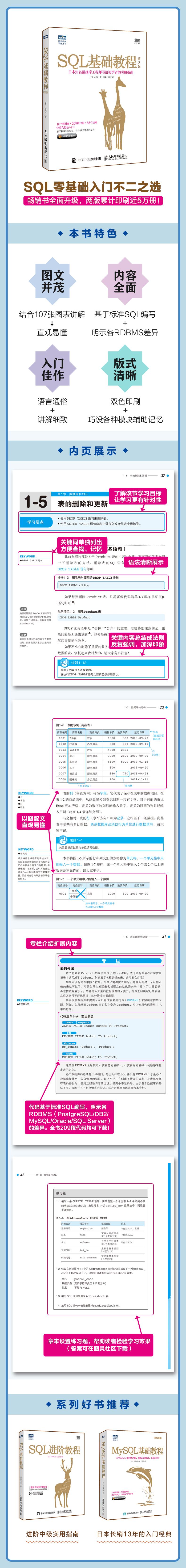 本书是畅销书《SQL基础教程》第2版,介绍了关系数据库以及用来操作关系数据库的SQL语言的使用方法。书中通过丰富的图示、大量示例程序和详实的操作步骤说明,让读者循序渐进地掌握SQL的基础知识和使用技巧,切实提高编程能力。每章结尾设置有练习题,帮助读者检验对各章内容的理解程度。另外,本书还将重要知识点总结为“法则”,方便读者随时查阅。第2版除了将示例程序更新为对应近期新的DB的SQL之外,还新增了一章,介绍如何从应用程序执行SQL。