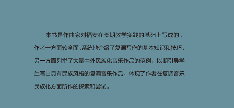 本书是作者在长期教学实践的基础上写成的,一方面较全面系统地介绍和讲授了复调写作的基本知识和技巧,帮助学生掌握一般复调写作的原则和规律;另一方面又列举了大量中外民族化音乐作品的范例,以引导学生写出具有民族风格的复调音乐作品。全书体现了作者在复调民族化方面所作的有益探索和尝试。