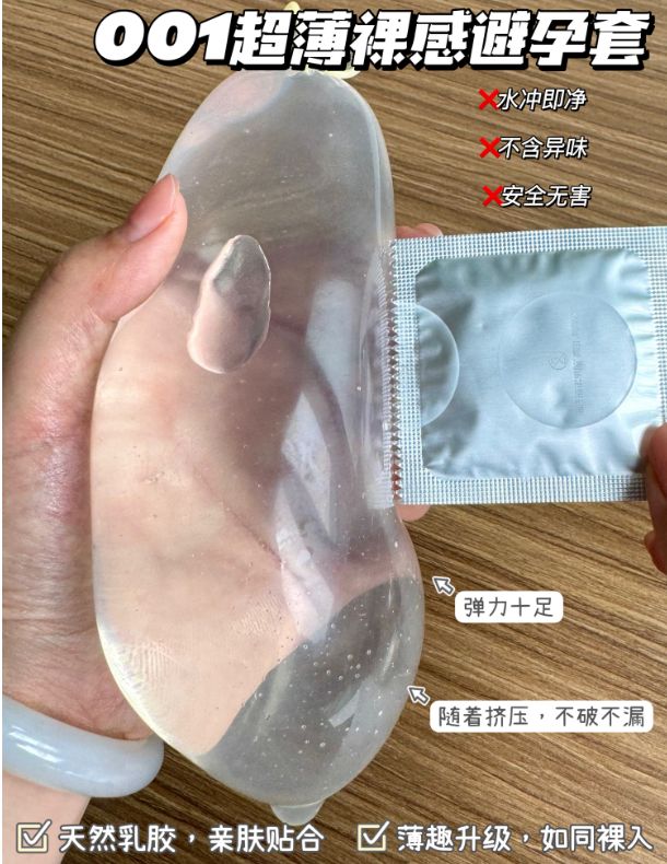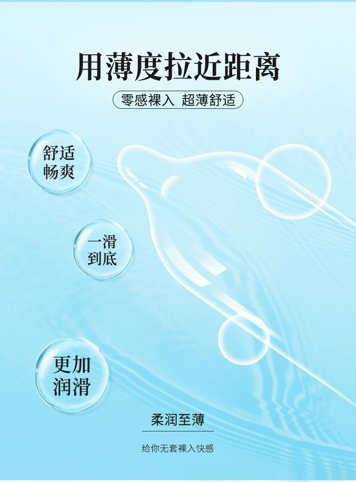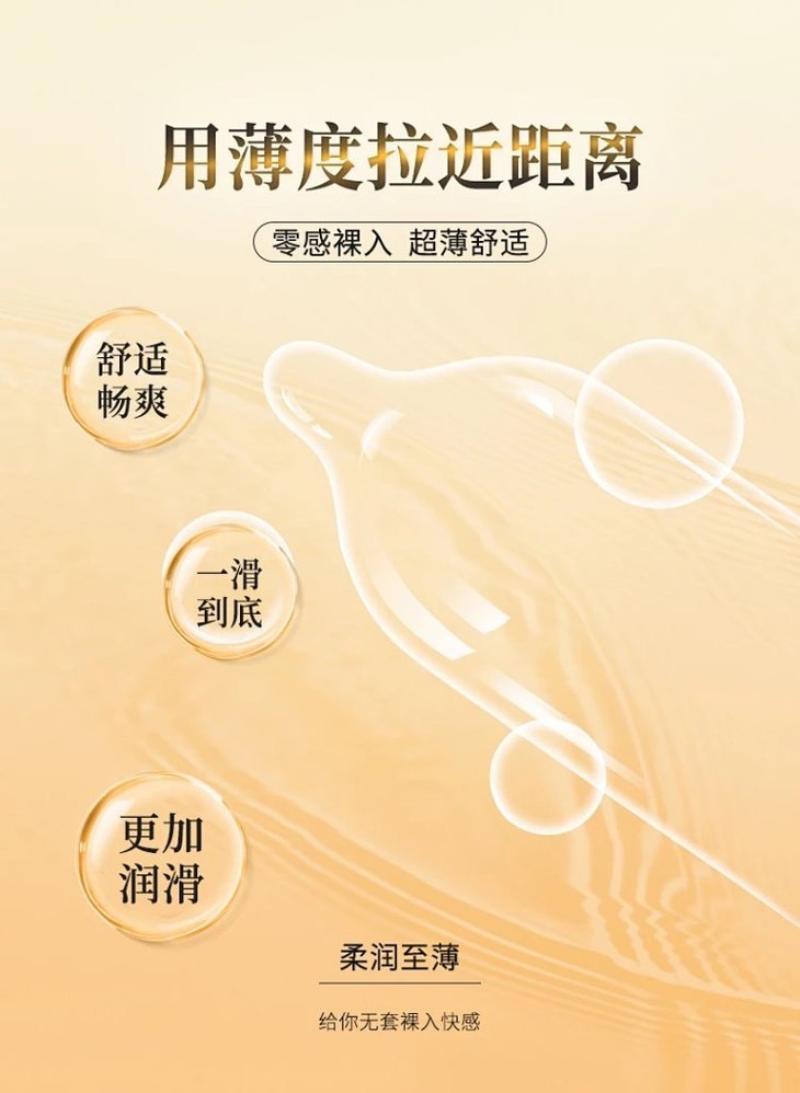 原材料均采用优质天然胶乳材质 真实触感,韧度更强,贴合人体自然曲线,剧烈摩擦柔韧不破; 天然纯净,无香无味 经过反复提炼,打造极致薄度, 使之柔韧,更加贴身, 让您与爱人紧密结合, 感受如肌肤般的真实触感