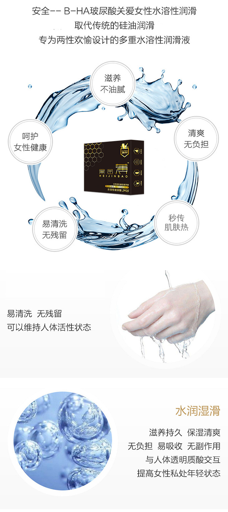 玻尿酸润滑剂: 滋养女性秘密花园,溶于水容易清洗,长期使用改善私密环境 弹性十足,不容易破,对于男性能很好缓解“丁丁”疲乏状态, 对于女性能保湿锁水、保持润滑,更呵护私处, 使用初期有凉感,随着身体接触逐渐感觉温热,体验度更好更敏感。