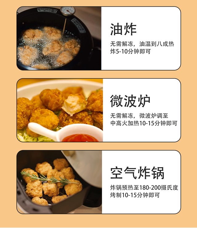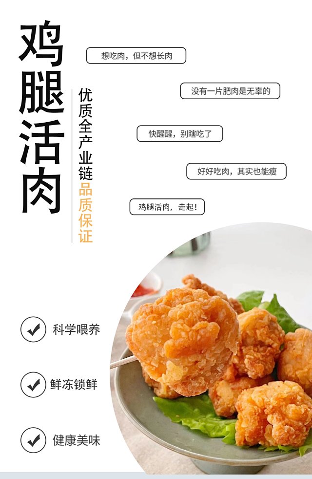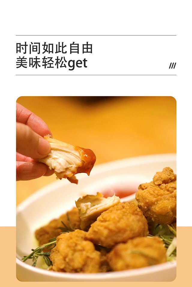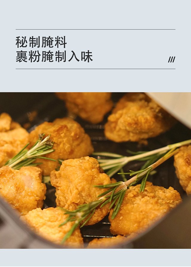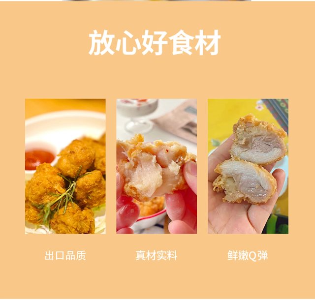 口感松软 市面炸鸡块类产品裹粉太多, 烹饪后口感硬实,内里鸡块又柴又老, 我们的鸡块因为独家超薄裹粉技术,入口香酥脆嫩 口感松软,好吃到飞起
