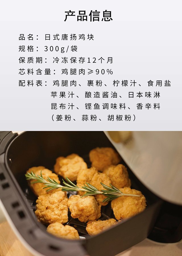 “减法料理”的另一层含义是加工过程对产品的品控,这款鸡块出成率是95%~98% ,简单来说,100斤鸡腿肉原料,裹粉完成后出的成品才95斤~98斤, 加工过程中去掉鸡皮下口感不好的组织部位,同时严格把控鸡腿肉部位,不用其它部位的鸡肉掺杂代替; 而国内众多鸡块产品, 出成率大多为120%~150% 甚至150%以上, 多为厚厚裹粉 鸡肉含量少,同时鸡肉部位选材不严格,根本无法享受到唐扬鸡块的美味