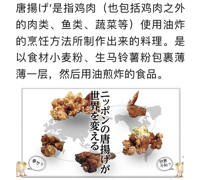 唐揚げ’是指鸡肉(也包括鸡肉之外的肉类、鱼类、蔬菜等)使用油炸的烹饪方法所制作出来的料理。是以食材小麦粉、生马铃薯粉包裹薄薄一层,然后用油煎炸的食品。”