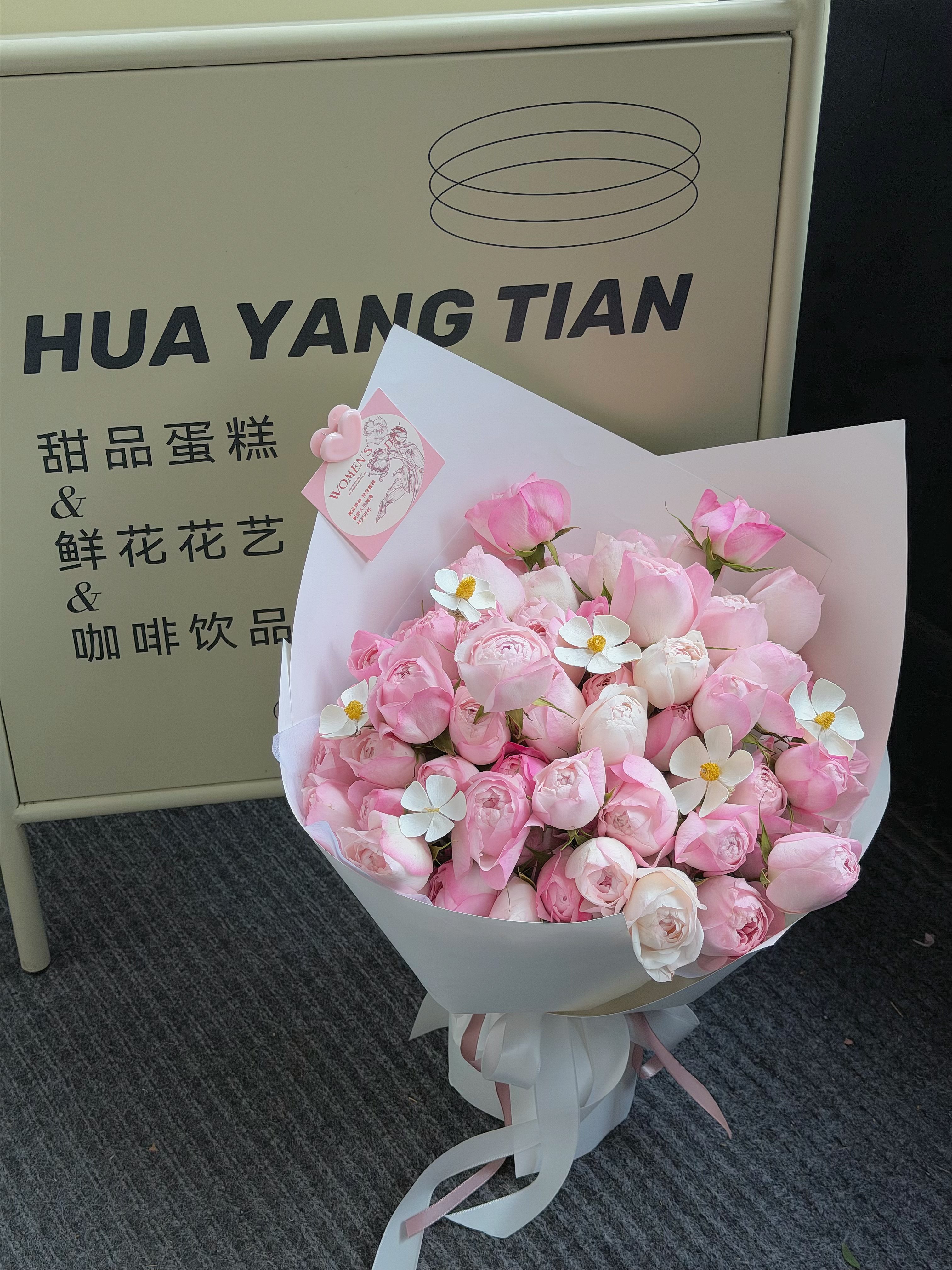 粉荔枝玫瑰的甜香混着白色花材的清透