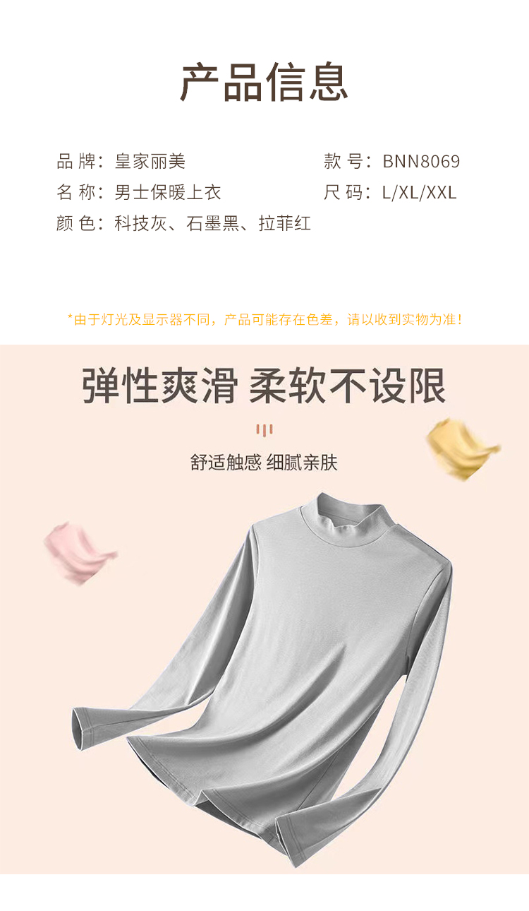【秒杀品,不退不换】皇家丽美男士保暖上衣柔软舒适弹性爽滑亲肤薄款BNN8069
