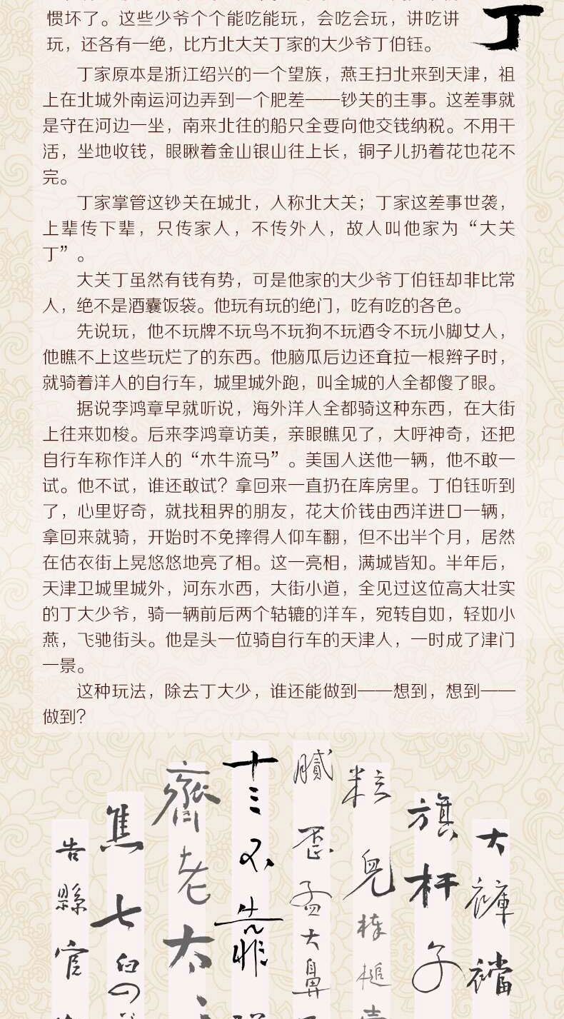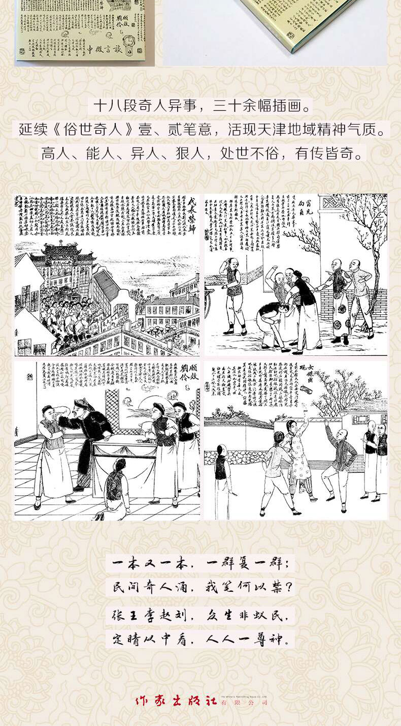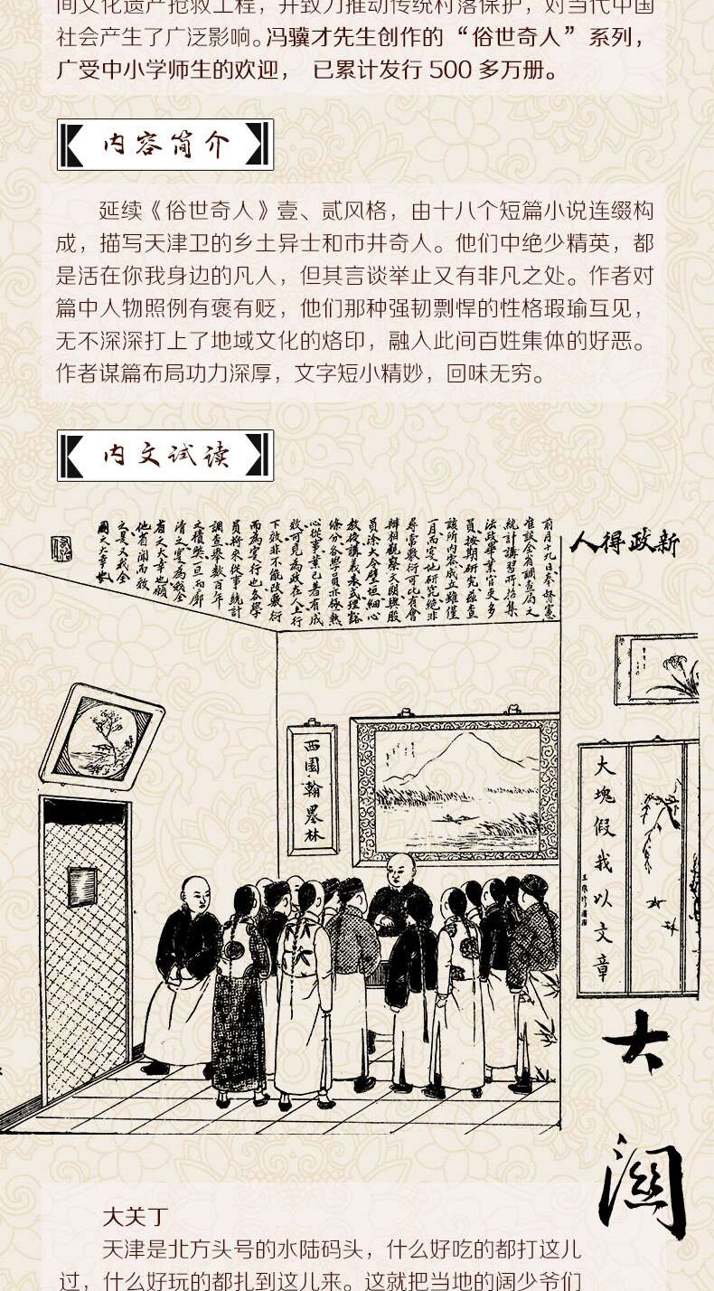 该书收录一系列短篇小说,描写清末民初天津卫的乡土异士和市井奇人。他们中绝少精英,都是活在你我身边的凡人,但其言谈举止又有非凡之处。作者对篇中人物有褒有贬,他们那种强韧剽悍的性格瑕瑜互见,无不深深打上了地域文化的烙印。作者谋篇布局功力深厚,文字简练准确,极富神韵,刻画的人物鲜活灵动,呼之欲出,令人回味无穷。书中配有同一时代《醒俗画报》刊载的多幅图画,大至时政要事,小到市井信息,生活气息浓郁,有助于读者感受与认知那个时代。该书畅销二十年,销量逾500万册,有篇目选入中小学语文教材,列入教育部基础教育课程教材发展中心发布的《中小学生阅读指导目录(2020年版)》。
