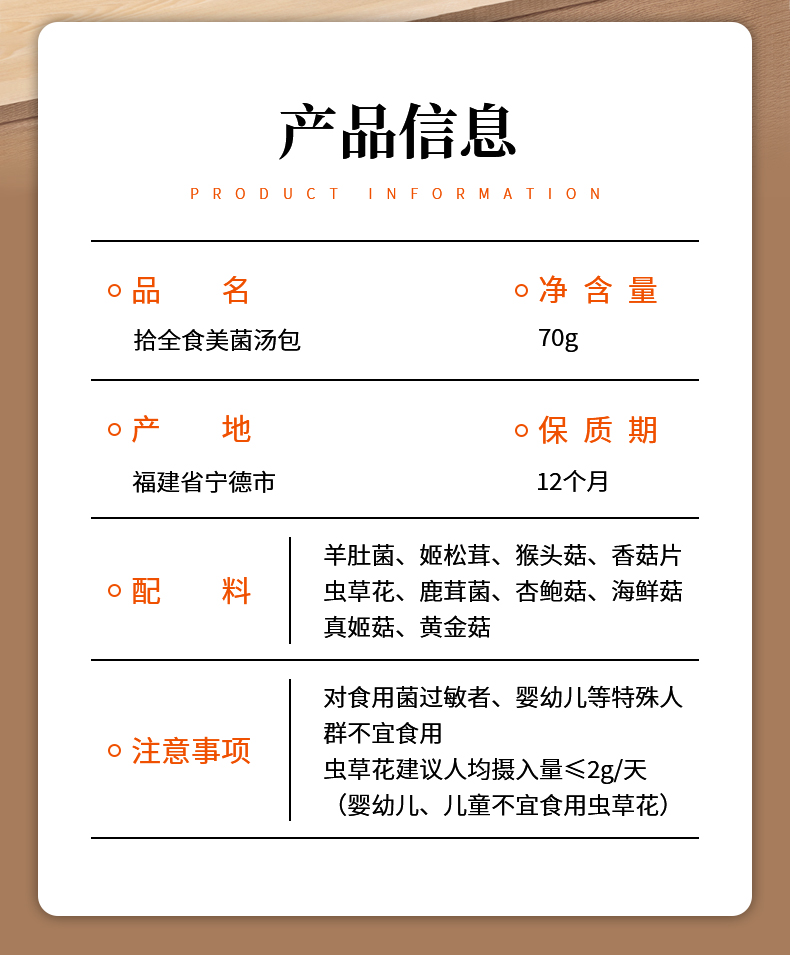 【配料】:羊肚菌、姬松茸、猴头菇、香菇片虫草花、鹿茸菌、杏鲍菇、海鲜菇、真姬菇、黄金菇