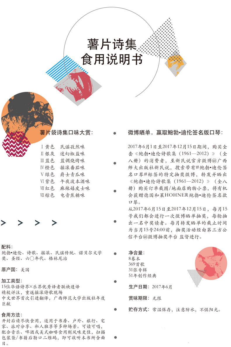 获诺奖意味着成为经典作家?鲍勃·迪伦永远无法被定义。他是僭越者,他是反叛之王,他既经典又反正典,既畅销又反流行,既是从时代土壤中长出又彻底超越时代。因此,我们选择了“薯片袋”这一有着强烈美式风格的创意包装,希冀这一袋诗集能像薯片一样,从书店走向街头,从小众走向人群,出现在地铁、便利店、自动贩售机,延伸进每一个生活场景中。我们将试图打破快消品与经典读物的疆域,在消费主义的时代里横冲直撞,让人与诗歌重新相遇。