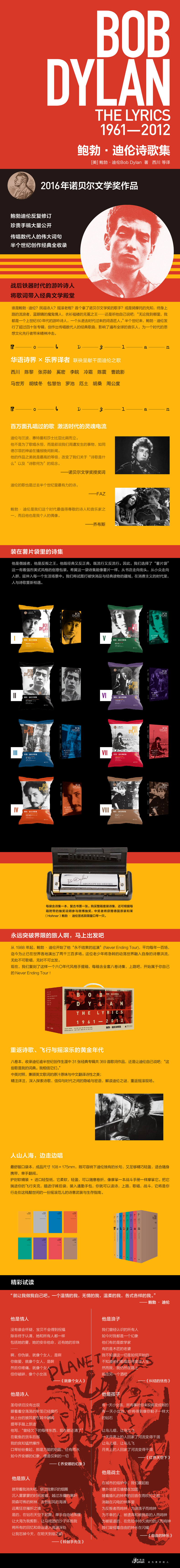 八卷本,收录鲍勃·迪伦逾半世纪创作生涯中三十一张经典专辑共三百六十九首歌词作品,还是让迪伦自己说吧:“这些歌是我的词典。我相信它们。”