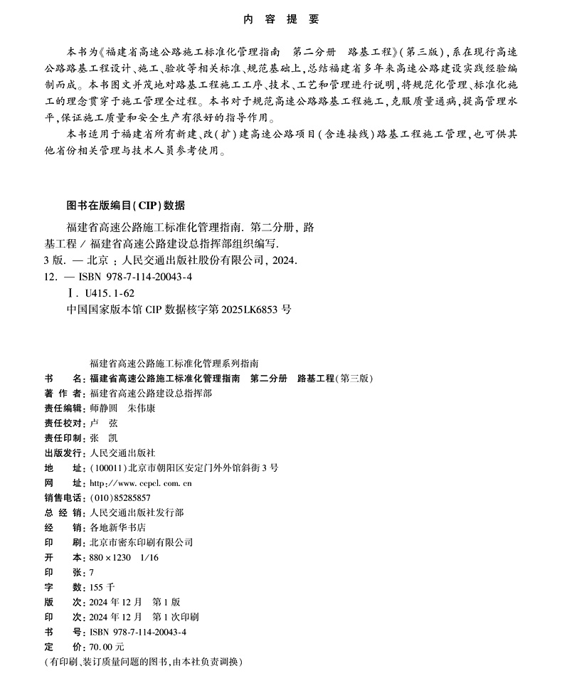 书名:福建省高速公路施工标准化管理指南 第二分册 路基工程 (第三版)