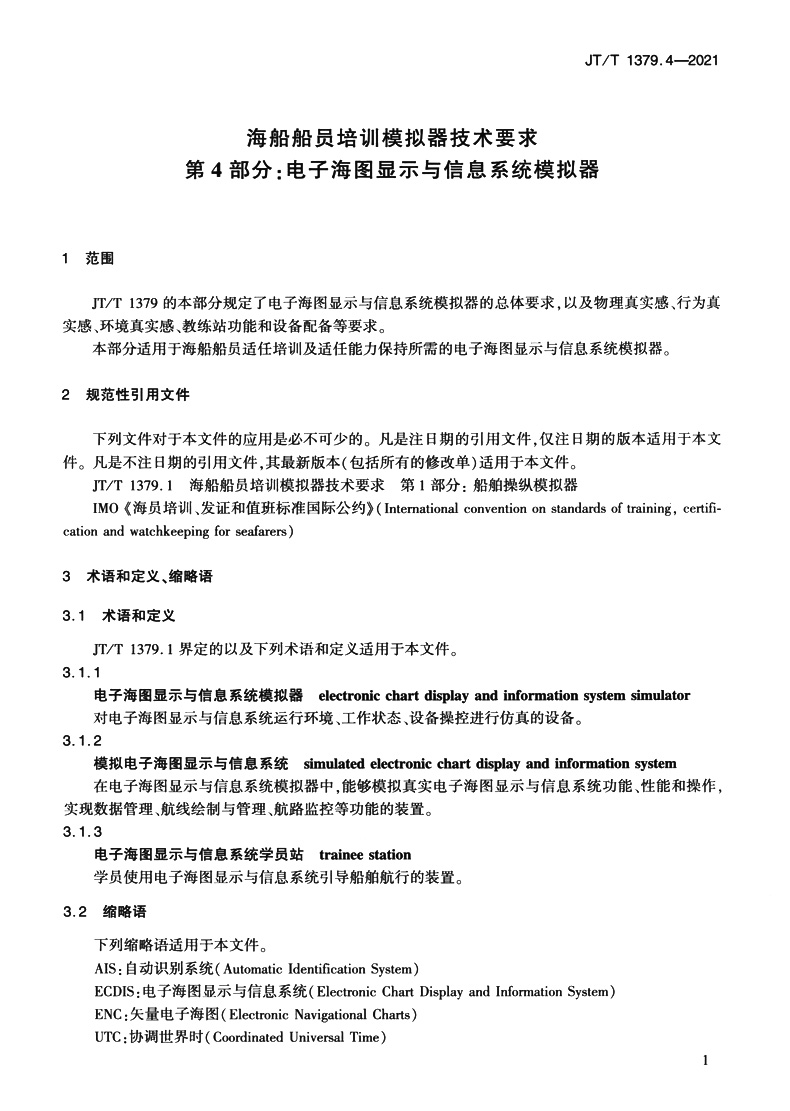 海船船员培训模拟器技术要求 第4部分:电子海图显示与信息系统模拟器(JT/T 1379.4—2021)
