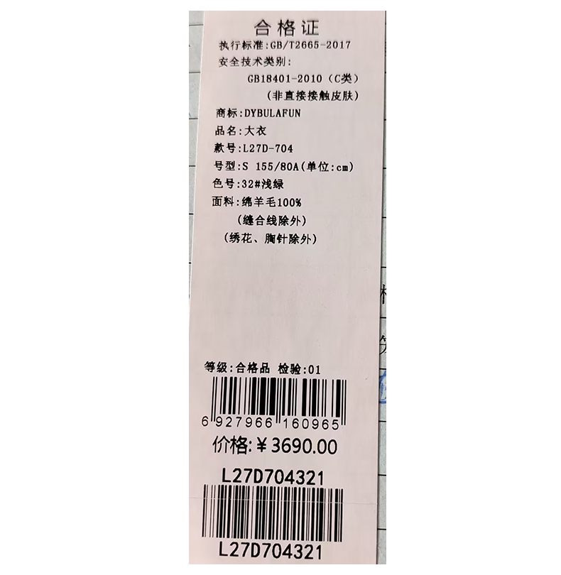 戴布拉芬呢大衣L27D704