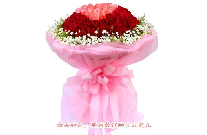 用心爱你---99枝精品玫瑰花束:33枝粉色玫瑰组成的心形居中,66枝红玫瑰环绕,周围满天星点缀 里层粉色纸,外层粉色珠光纱,粉色丝带花结(1040)