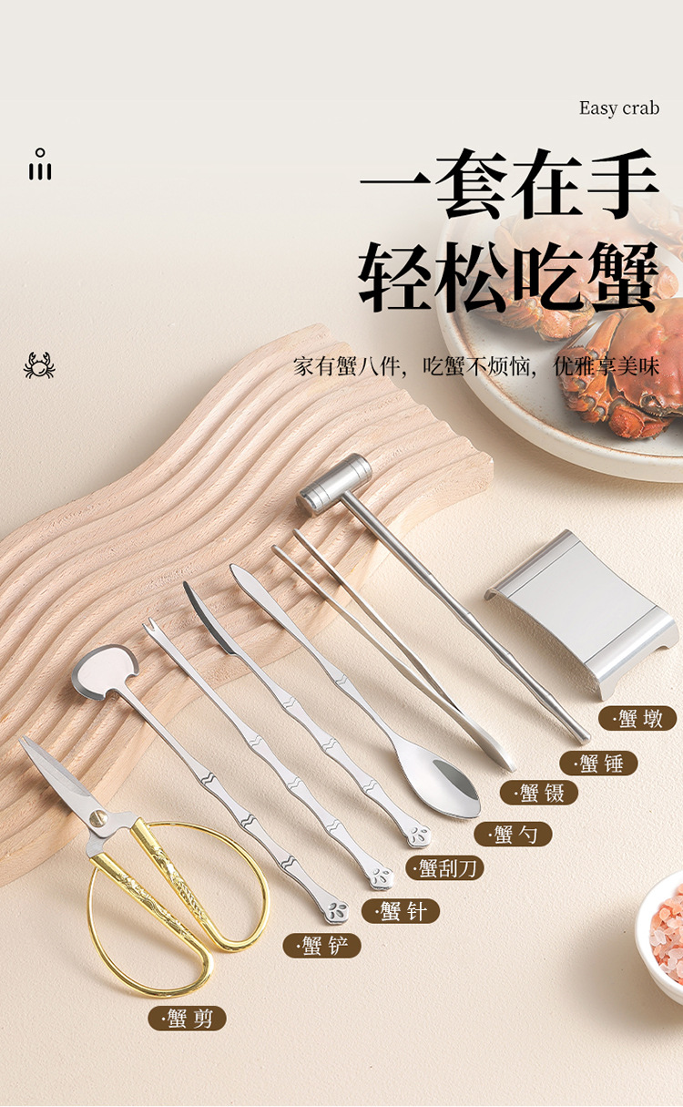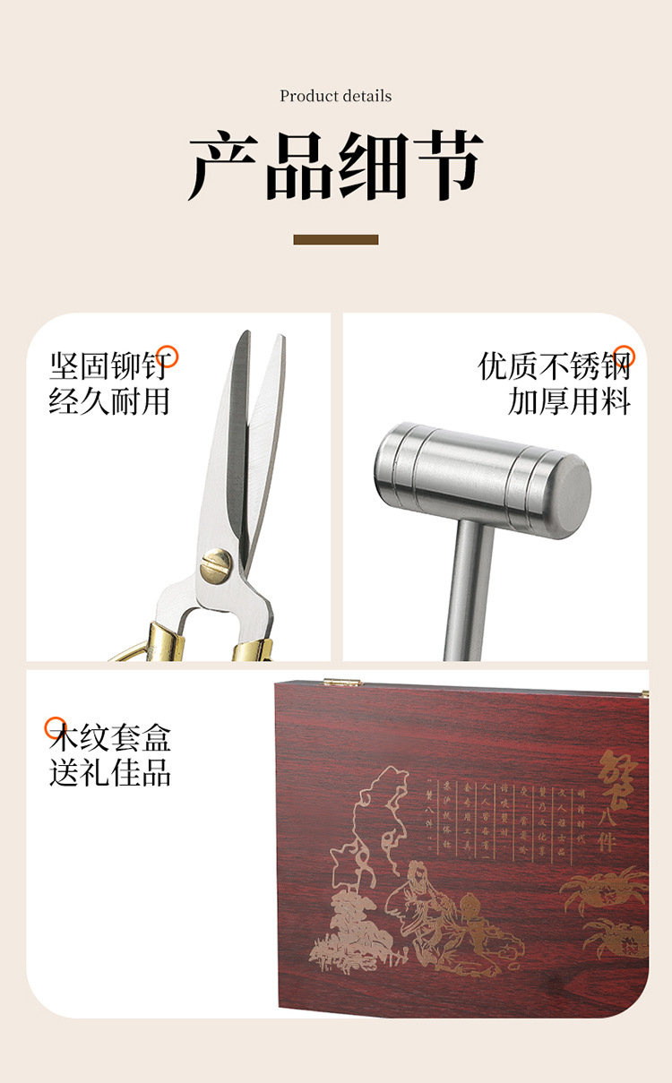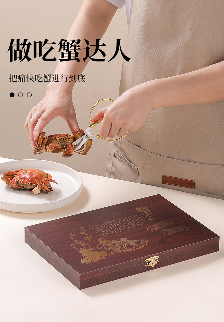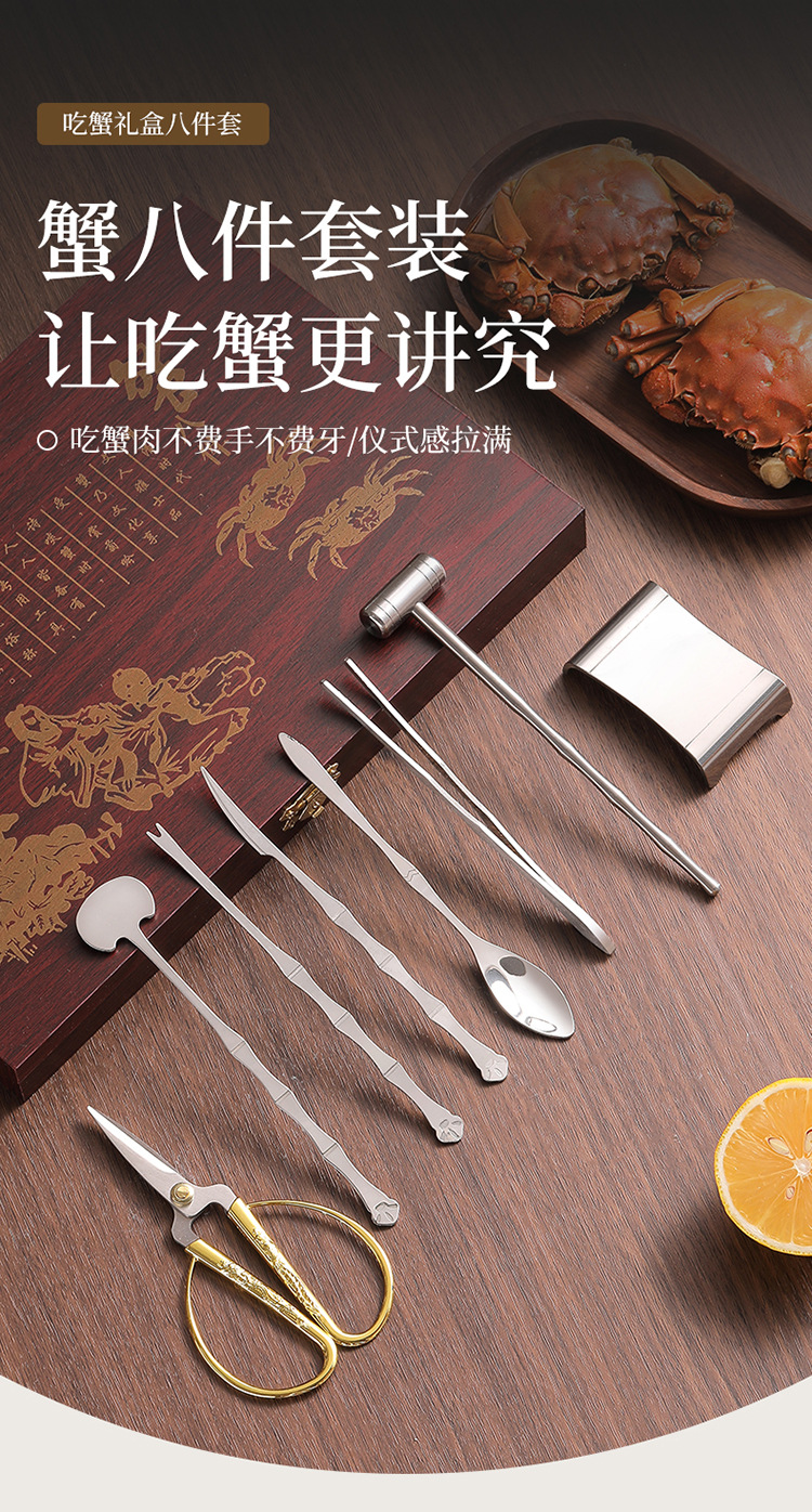 木盒蟹八件不锈钢吃蟹工具 礼品大闸蟹剥蟹套装 品蟹工具礼盒装剥蟹