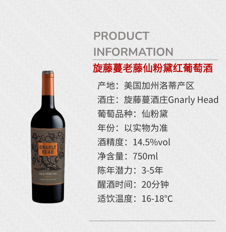 美国加州旋藤蔓老藤仙粉黛红葡萄酒 商品图4