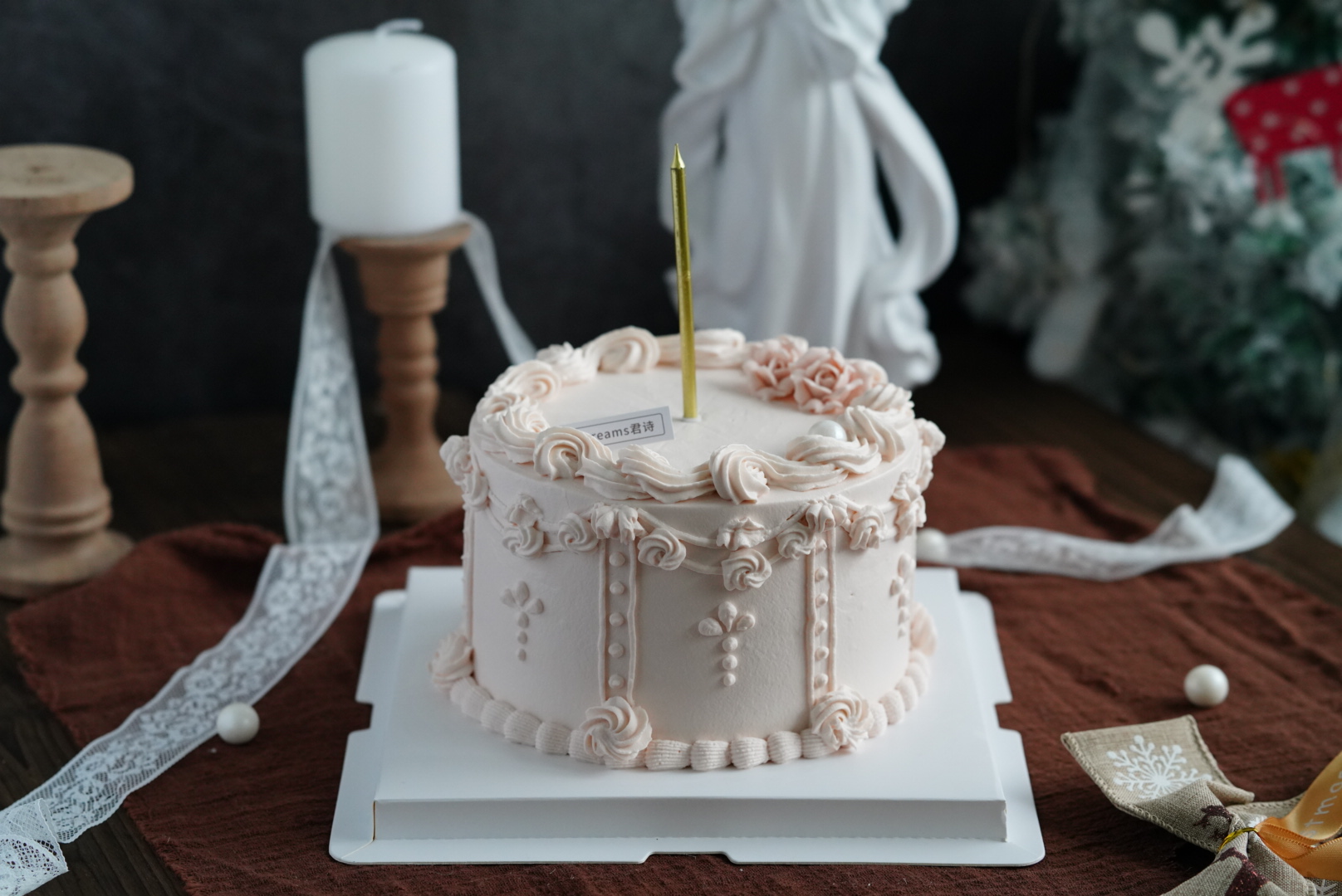 温柔知性的豆沙粉,没有过多颜色的渲染,仅靠细节感满满的奶油花边丰富造型,顶部两朵豆沙裱花的加入也使得温柔气息又浓了一些。