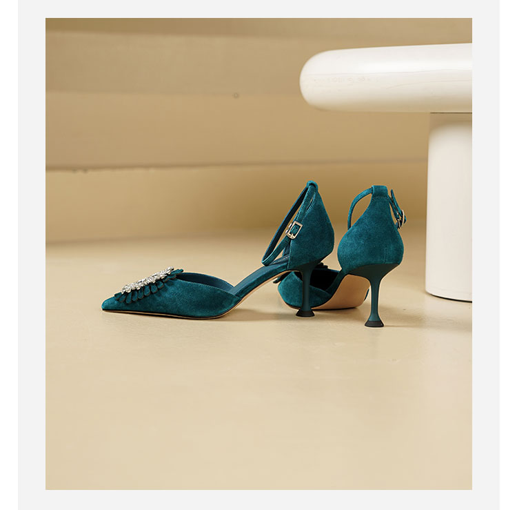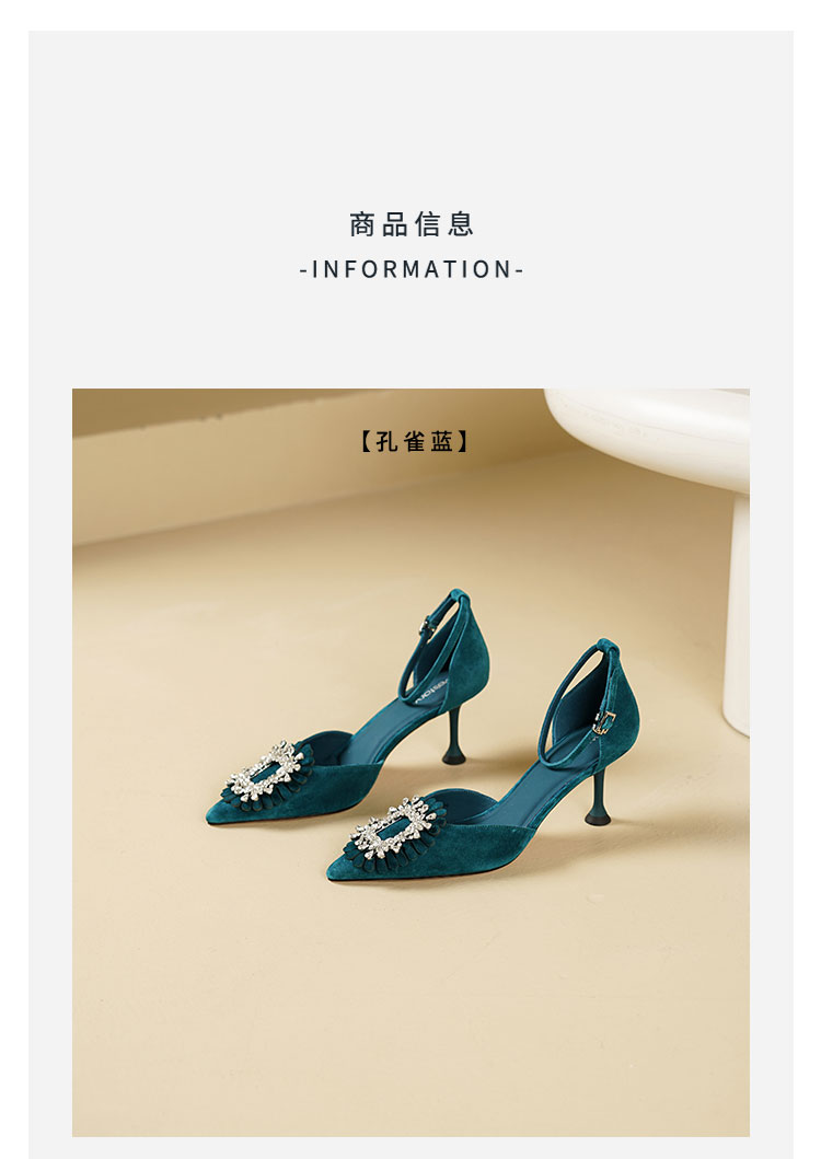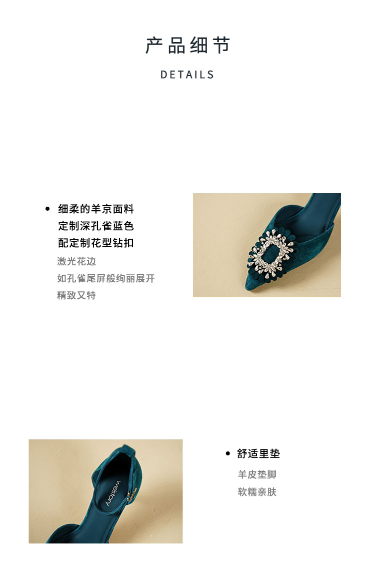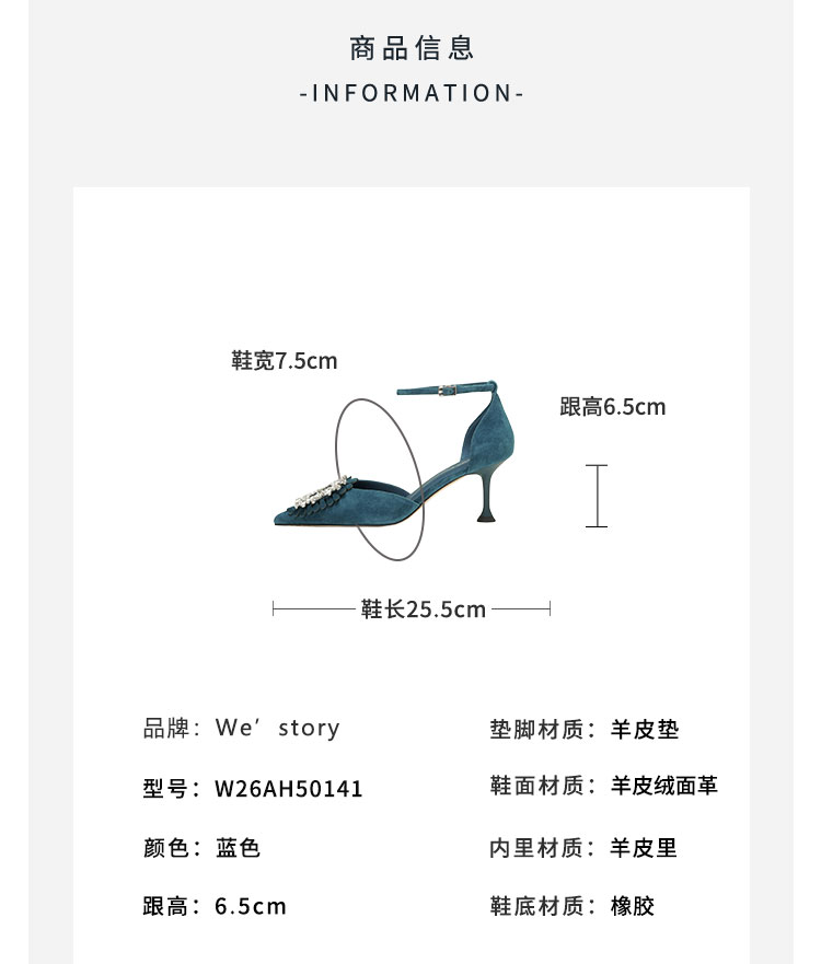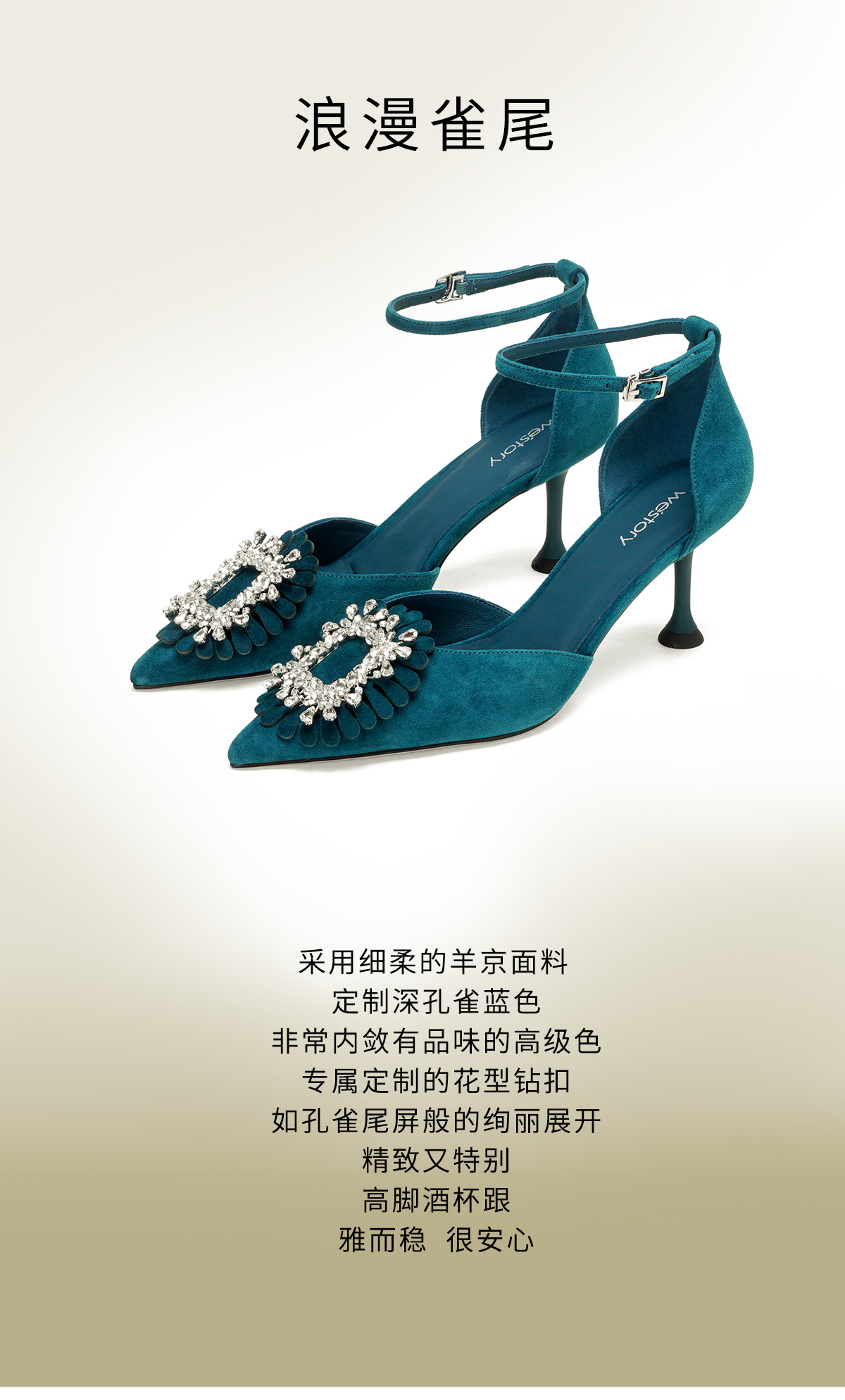 Westory2026年春季尖头中跟羊京孔雀蓝配花型方扣中空单鞋晚宴鞋W26AH50141