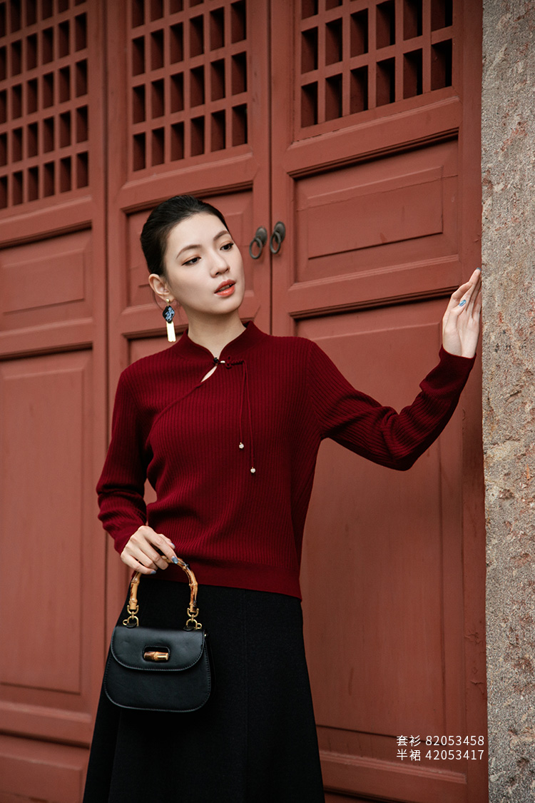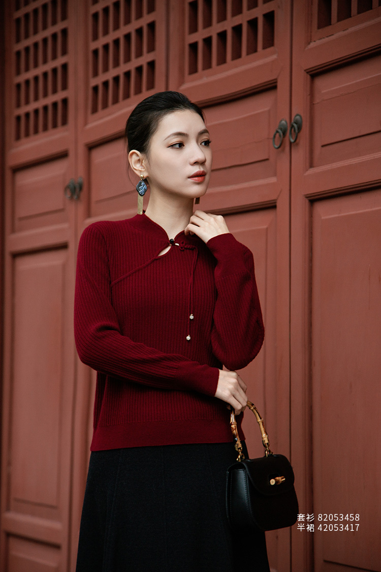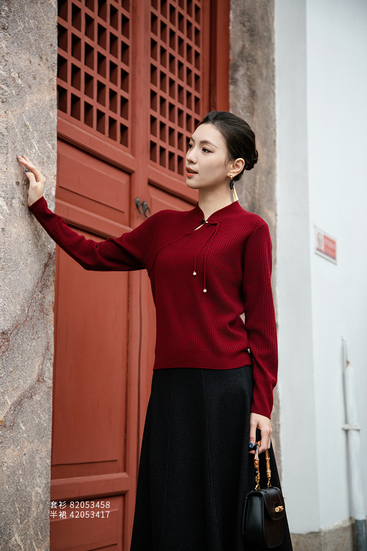 【国风盘扣坑条纹羊绒衫】羊绒世家秋冬新品女士100%山羊绒修身显瘦针织毛衣