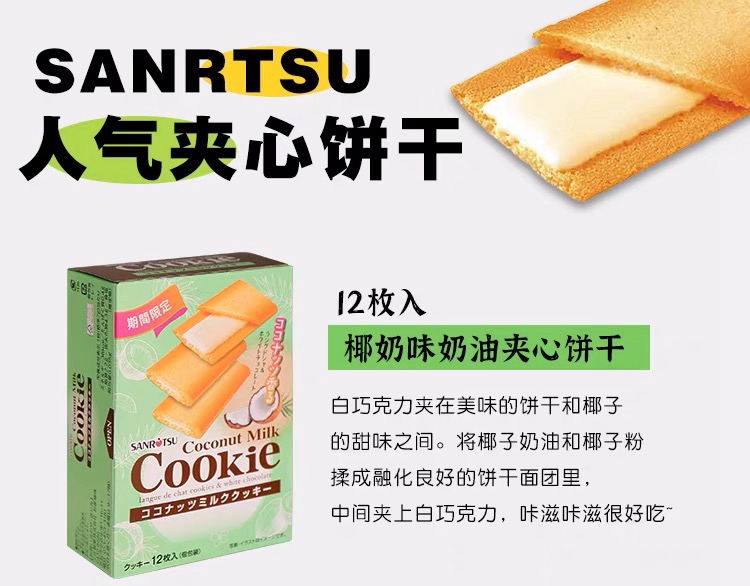 日本三立椰奶味夹心薄酥饼干84g/053323 限定款白巧克力夹在美味的饼干和椰子的甜味之间