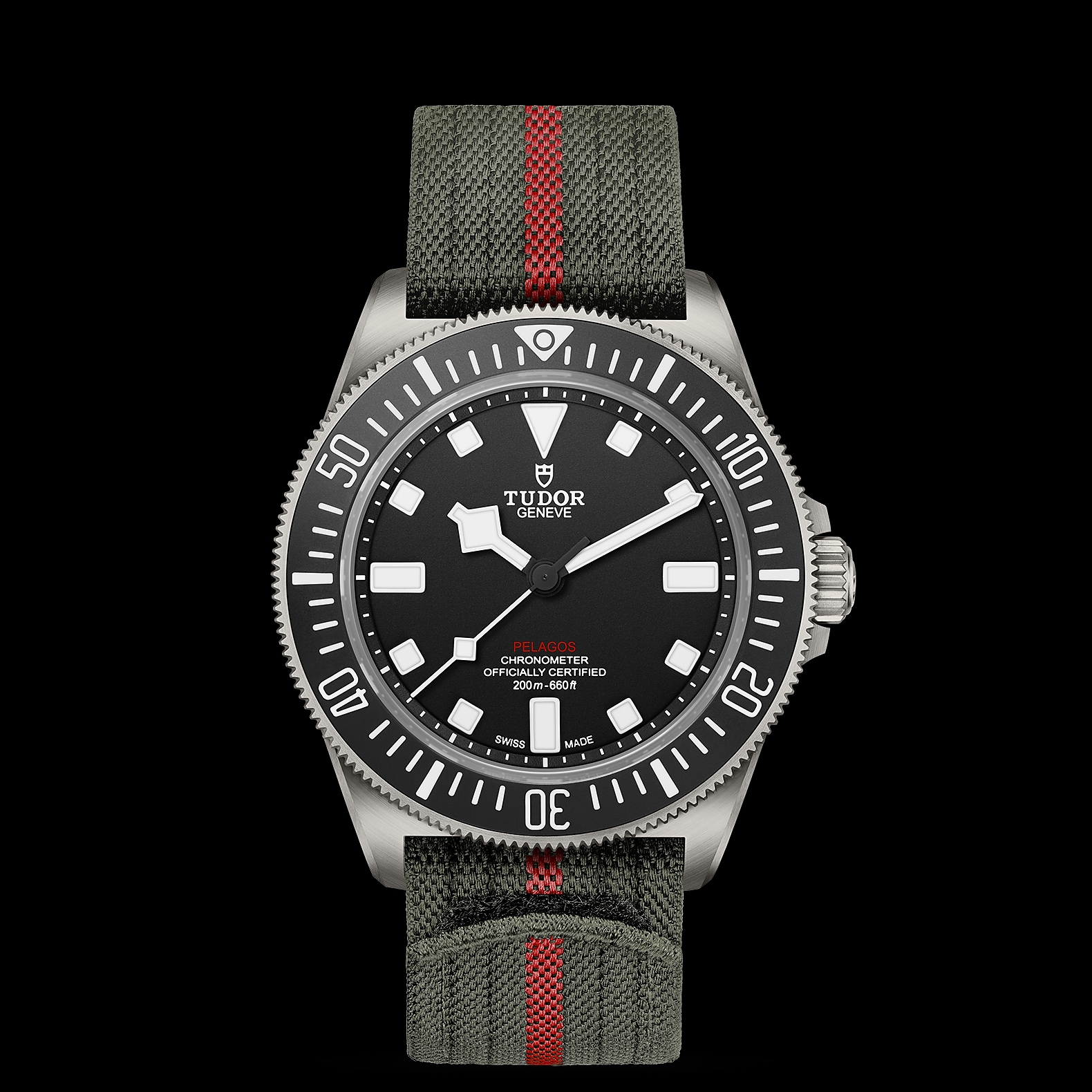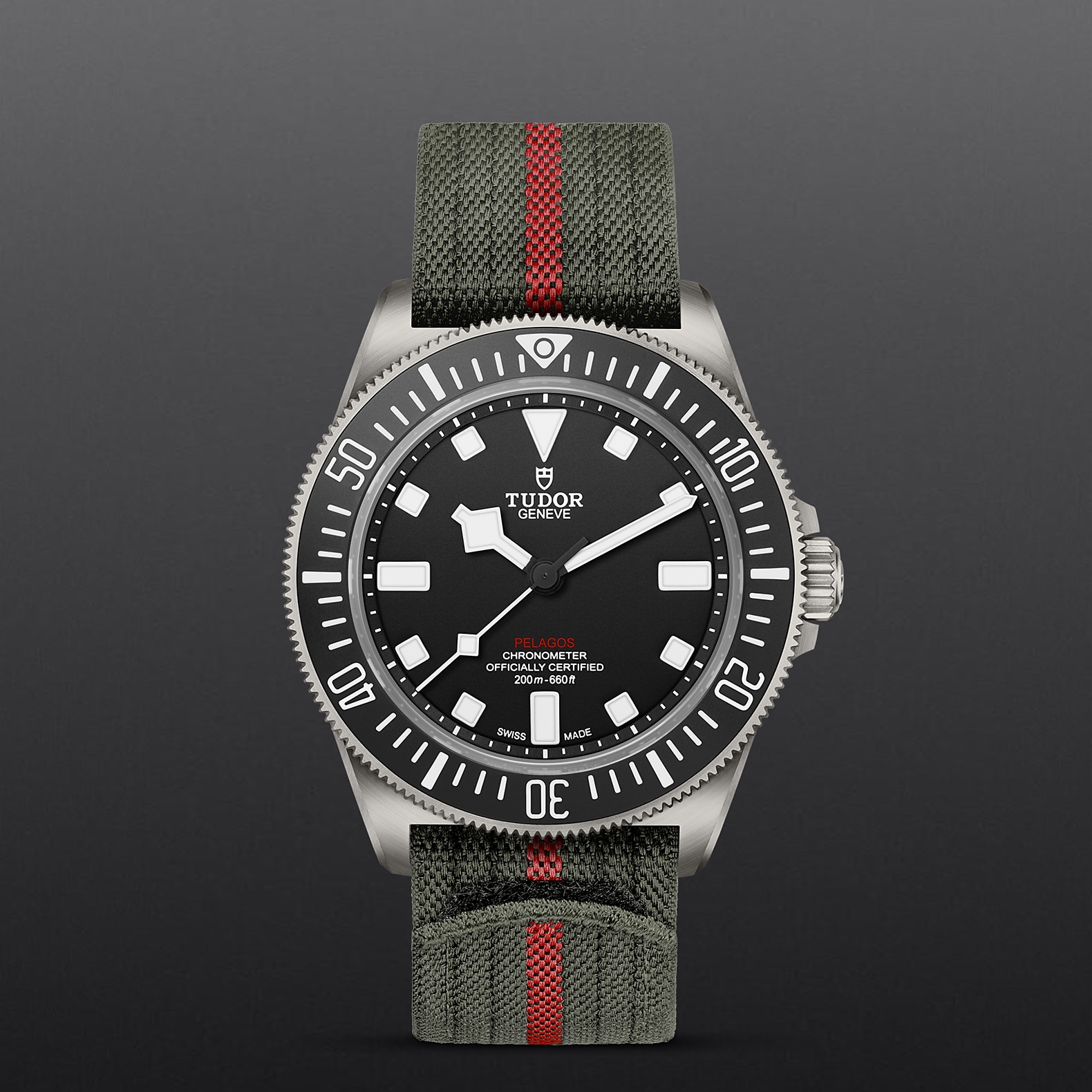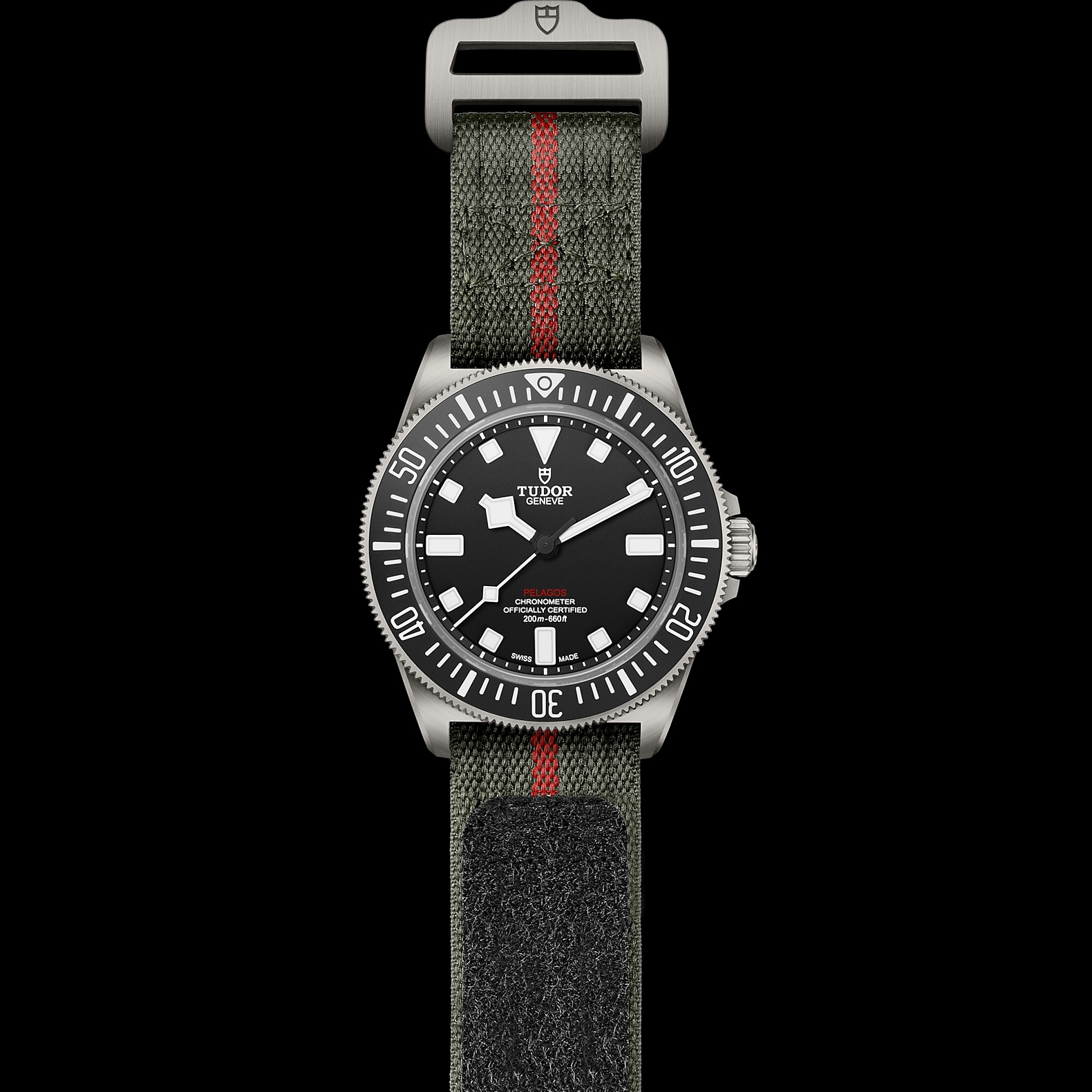 22毫米军绿色织纹表带,中央饰以红色条纹,配自黏式带扣