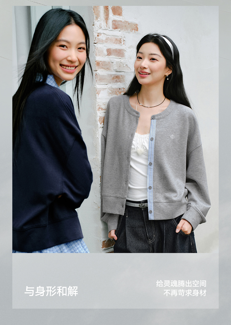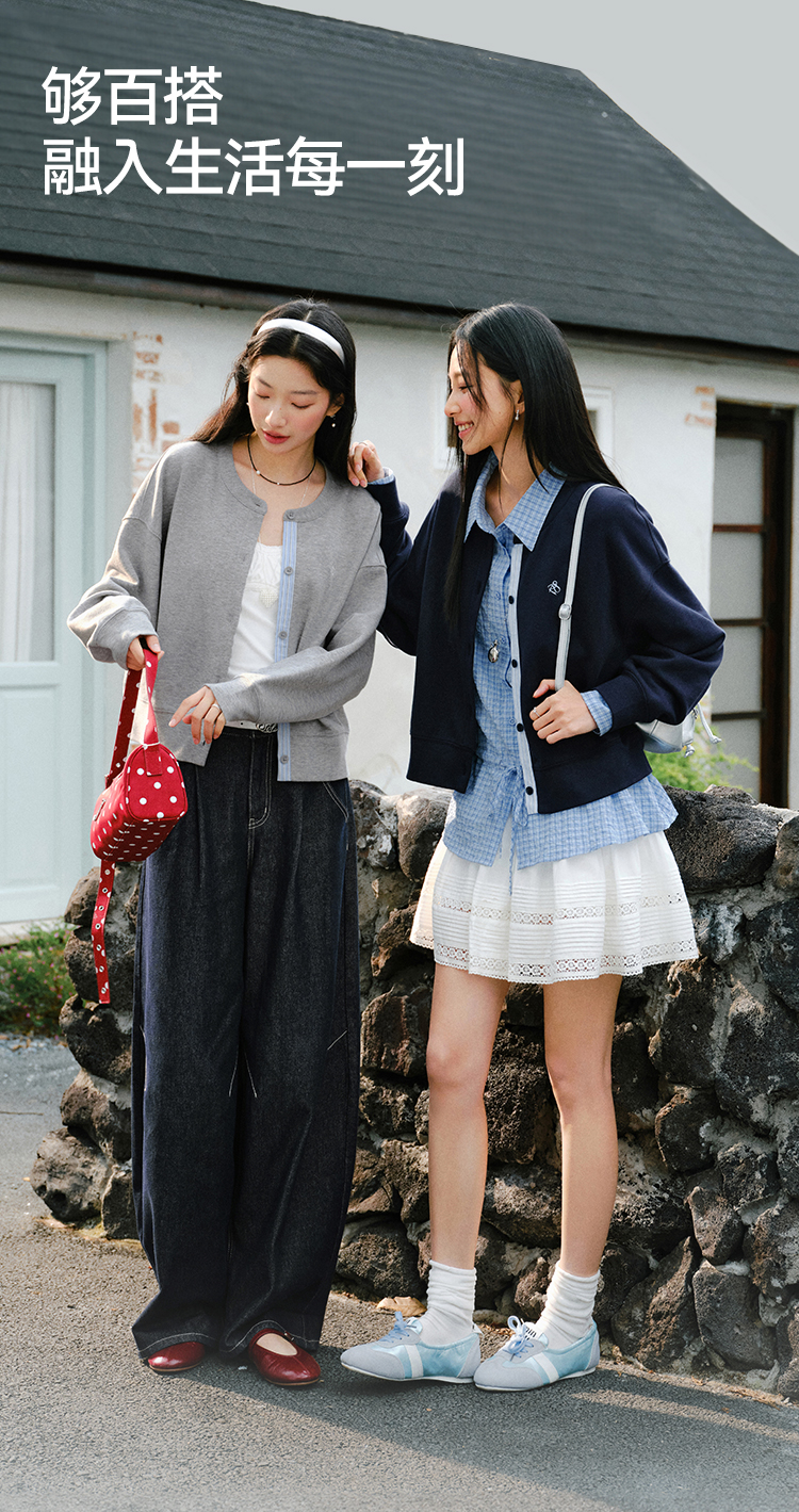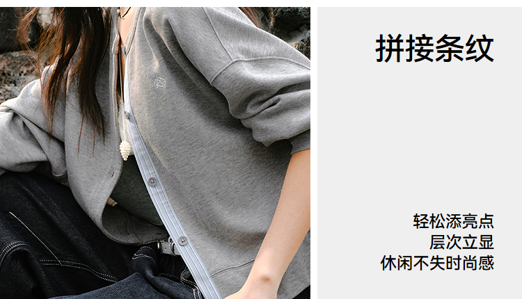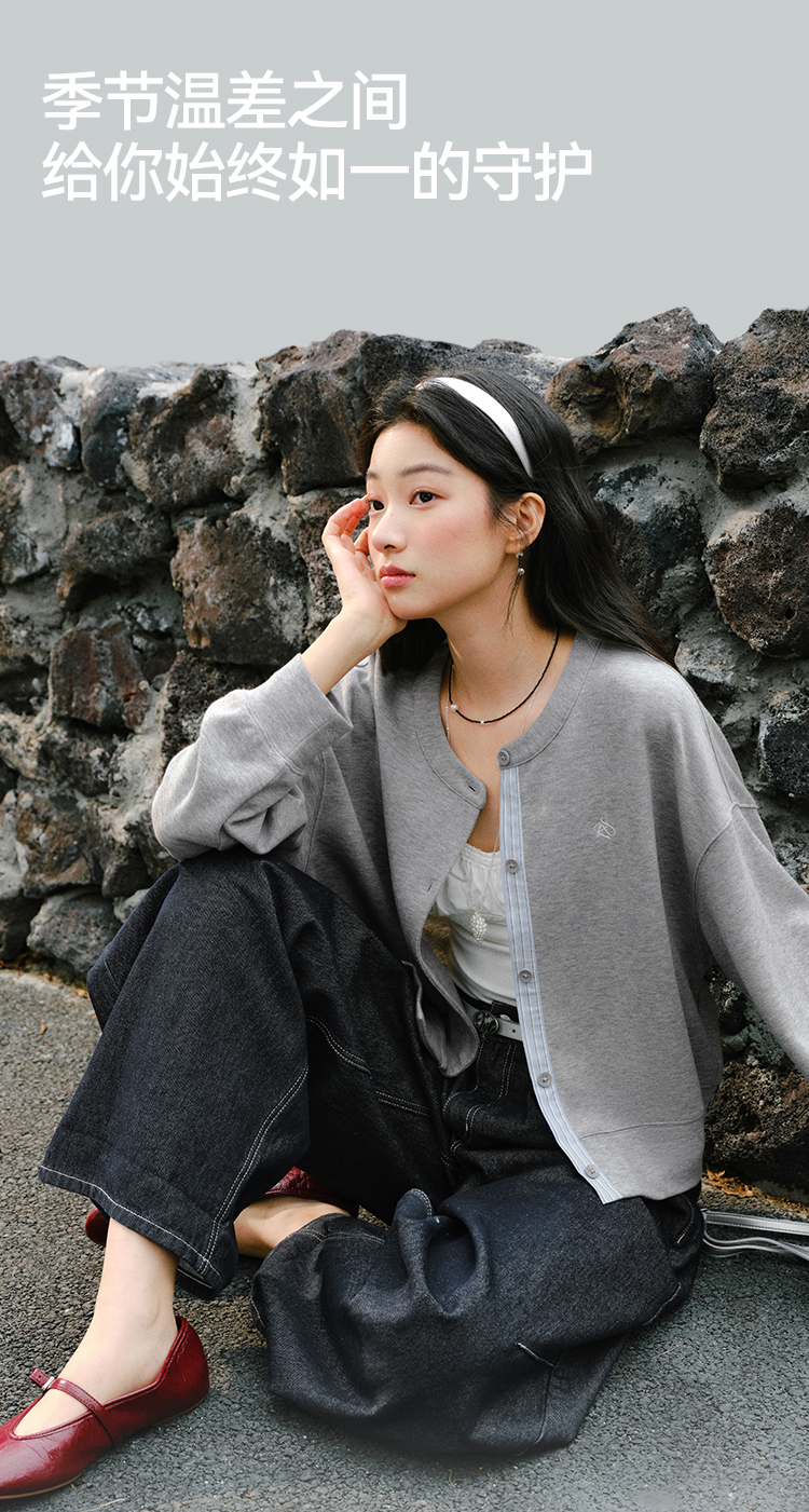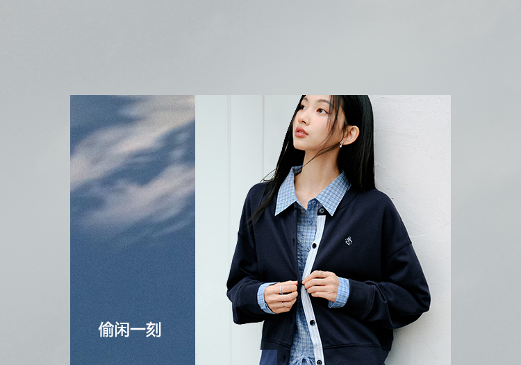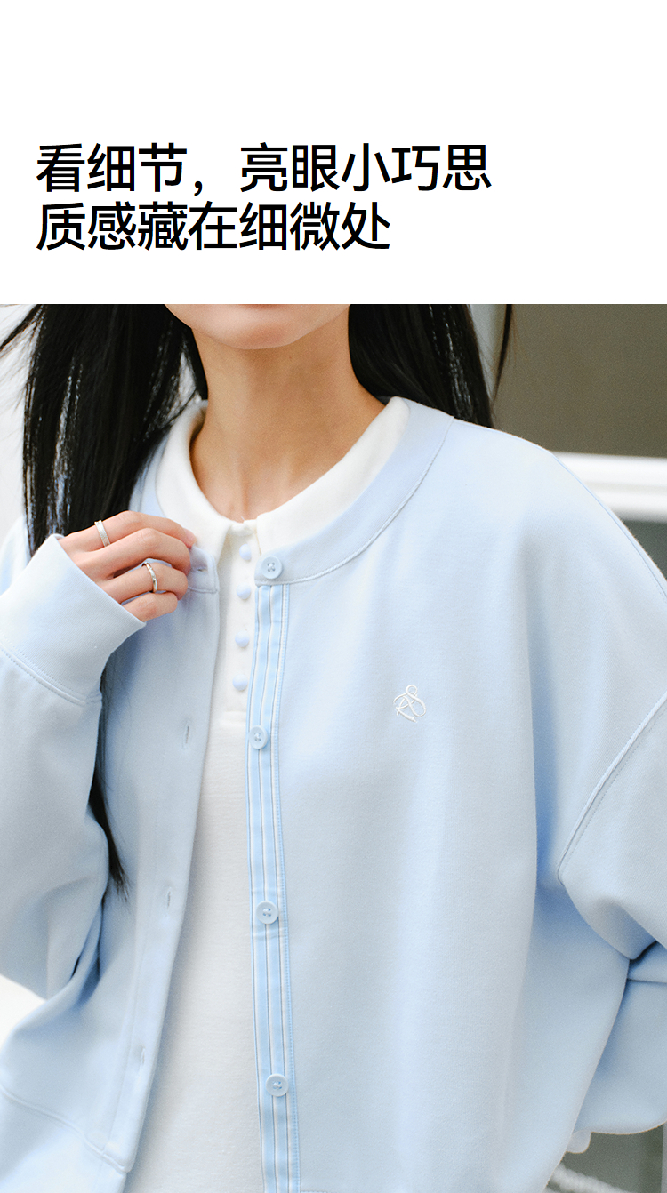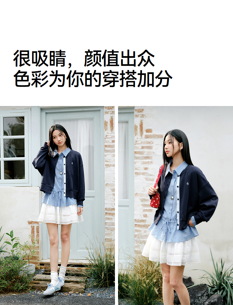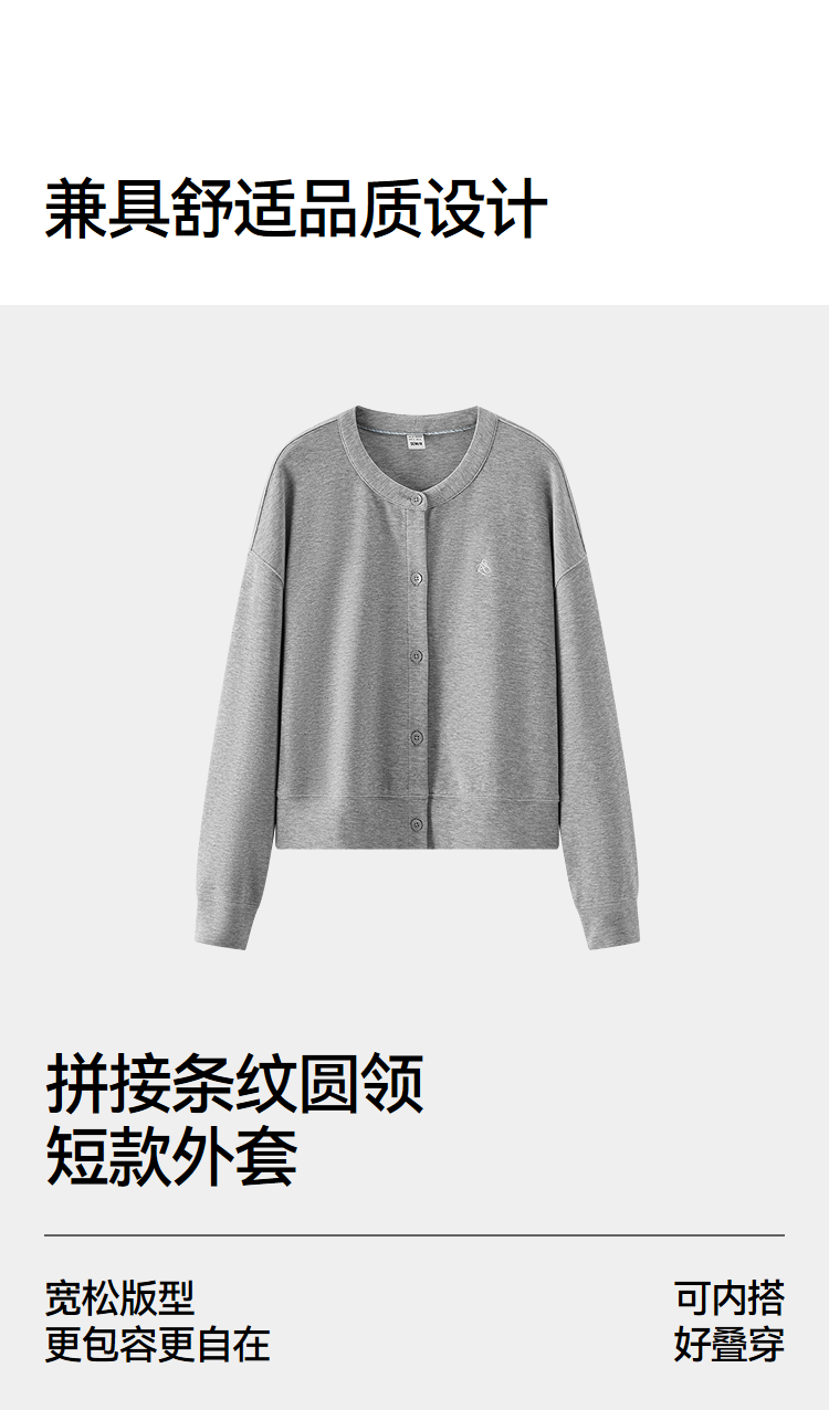 森马外套女春短款圆领拼接条纹宽松落肩刺绣内搭2026新款叠穿夹克