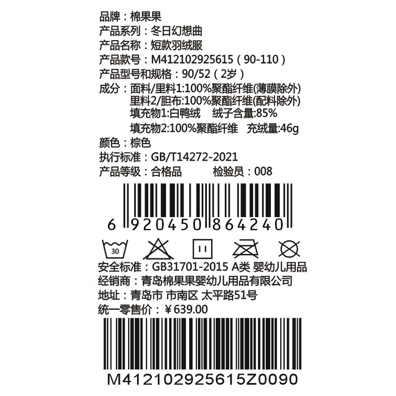 填充物:白鸭绒