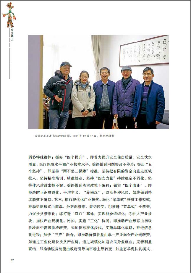 本书是一部纪实文学作品,是中国摄协统一规划和组织实施的“影像见证新时代 聚焦扶贫决胜期:2018—2020大型影像跨界驻点调研创作工程”系列图书中的一本。书稿以陇县为驻点,自2018年8月起,陇县驻点调研创作项目组一行5人6次到陇县做调研与回访调查,走访了20多个村庄,深度采访了20多个乡村第一书记、村委会主任和村干部,也采访了陇县县委书记,并一同走访调研了乡村扶贫工作中的典型个案。其后则着重叙述了陇县当地的民俗艺术,以及以脱贫个案的形式展示了当地是怎样以民俗艺术为依托来带动当地经济发展的。书稿整体结构的策划是完整的,内容的呈现也是图文相辅、点面结合且条理清晰。