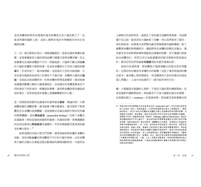 達馬吉歐認為,人類腦部發展出的「自我」挑戰了自然的漠不關心,並為文化的誕生開闢蹊徑,是演化過程中的一個徹底決裂,也是社會文化恆定的源頭。他直指他稱之為社會文化恆定之未竟工程的藍圖,乃是具有穩固基因根基的基本恆定,是簡單的生命形態存在了數十億年的價值的監護者。讀完本書,猶如走過一趟探索心智與自我之神經生物學基礎的創新旅程。