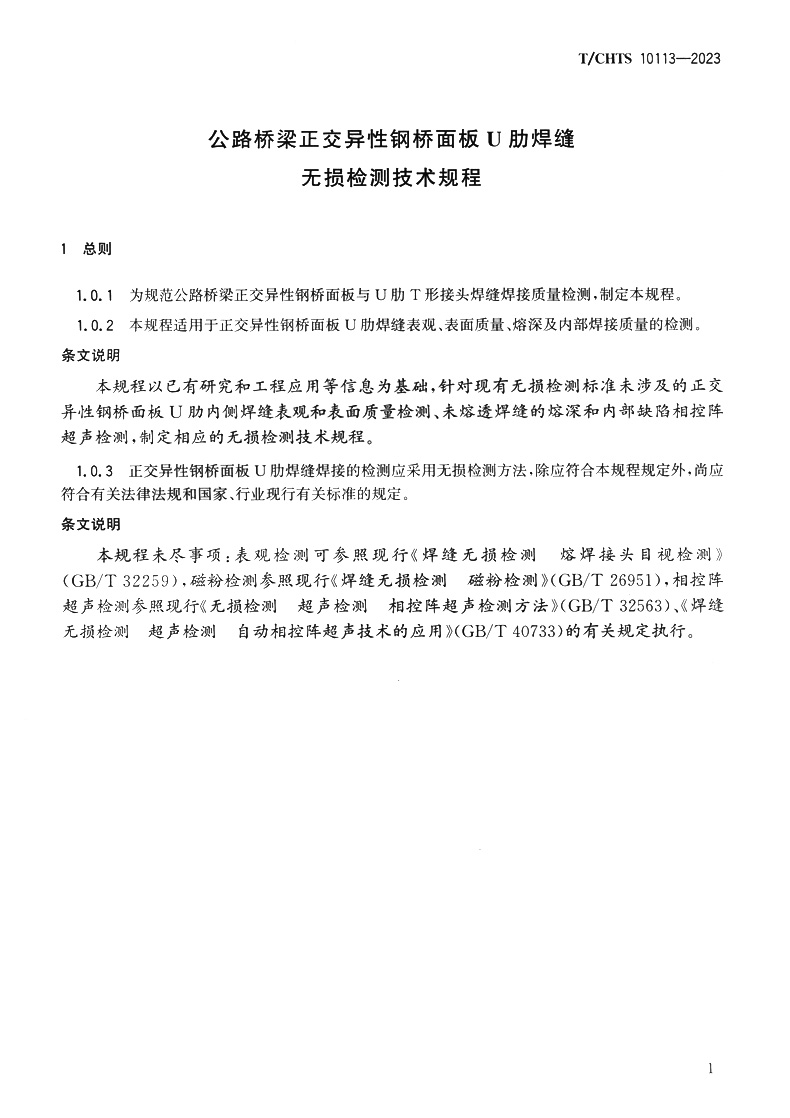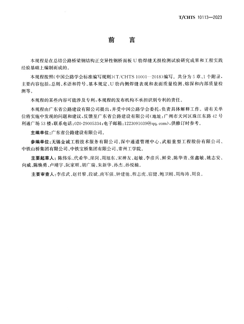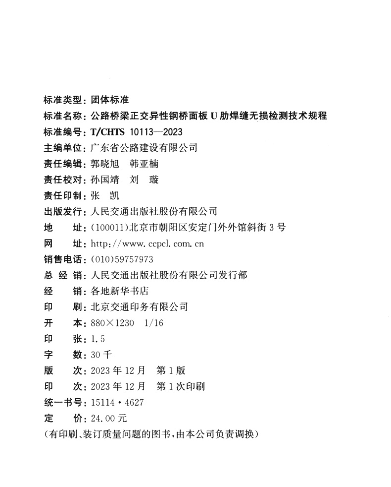 书名:公路桥梁正交异性钢桥面板U肋焊缝无损检测技术规程(T/CHTS 10113—2023)