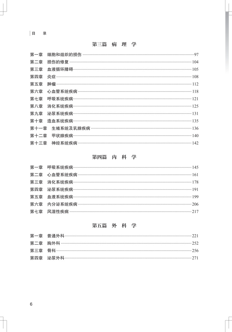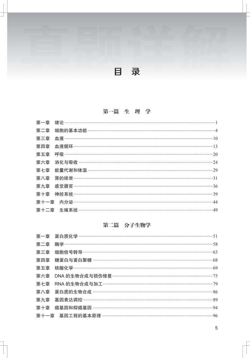 第一篇 生 理 学 第一章 绪论 /1 第二章 细胞的基本功能 /4 第三章 血液 /10 第四章 血液循环 /13 第五章 呼吸 /20 第六章 消化与吸收 /24 第七章 能量代谢和体温 /29 第八章 肾的排泄 /31 第九章 感觉器官 /36 第十章 神经系统 /39 第十一章 内分泌 /44 第十二章 生殖系统 /49 第二篇 分子生物学 第一章 蛋白质化学 /51 第二章 酶学 /58 第三章 细胞信号转导 /63 第四章 糖蛋白与蛋白聚糖 /68 第五章 核酸化学 /69 第六章 DNA 的生物合成与损伤修复 /75 第七章 RNA 的生物合成与加工 /79 第八章 蛋白质的生物合成 /86 第九章 基因表达调控 /89 第十章 癌基因和抑癌基因 /94 第十一章 基因工程的基本原理 /96 第三篇 病 理 学 第一章 细胞和组织的损伤 /97 第二章 损伤的修复 /104 第三章 血液循环障碍 /105 第四章 炎症 /108 第五章 肿瘤 / 112 第六章 心血管系统疾病 / 118 第七章 呼吸系统疾病 /121 第八章 消化系统疾病 /125 第九章 泌尿系统疾病 /131 第十章 造血系统疾病 /135 第十一章 生殖系统及乳腺疾病 /136 第十二章 甲状腺疾病 /140 第十三章 神经系统疾病 /142 第四篇 内 科 学 第一章 呼吸系统疾病 /145 第二章 心血管系统疾病 /161 第三章 消化系统疾病 /178 第四章 泌尿系统疾病 /191 第五章 血液系统疾病 /199 第六章 内分泌系统疾病 /206 第七章 风湿性疾病 /217 第五篇 外 科 学 第一章 普通外科 /221 第二章 胸外科 /252 第三章 骨科 /256 第四章 泌尿外科 /271