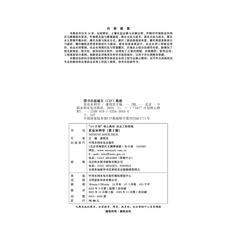 本教材是面向全国通用的高等学校农业水利工程专业核心教材,也可作为其他相关专业的教材和从事农业水利工作的工程师,技术员的参考书。