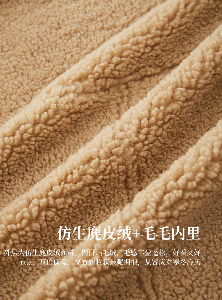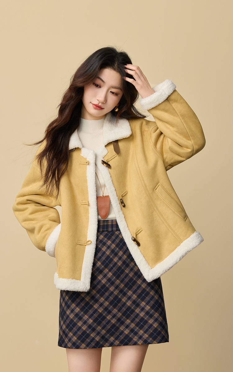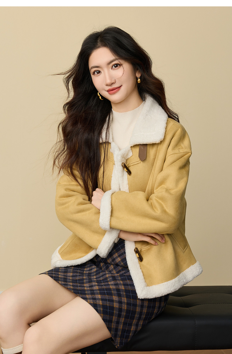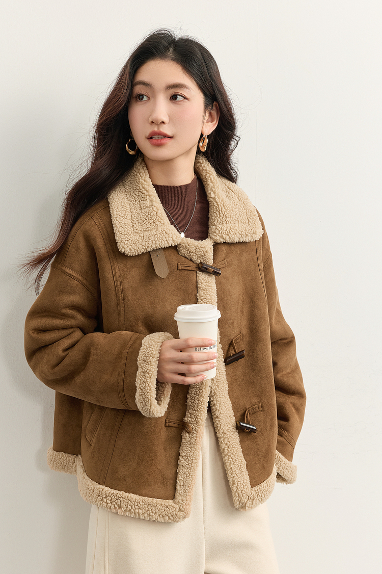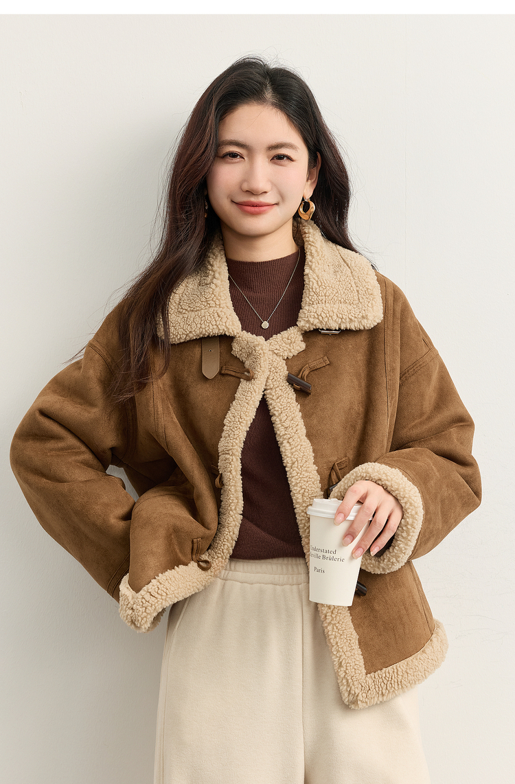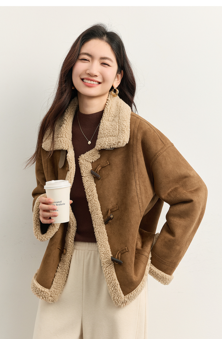【周四狂欢价】熙世界复古港风皮毛一体外套冬女装仿麂皮绒毛绒牛角扣短款大衣