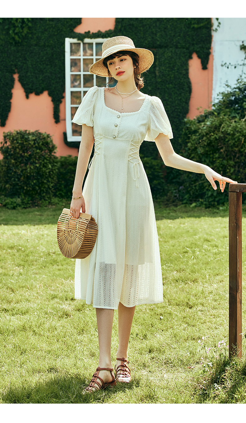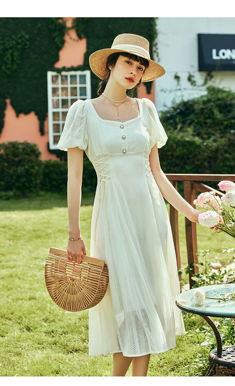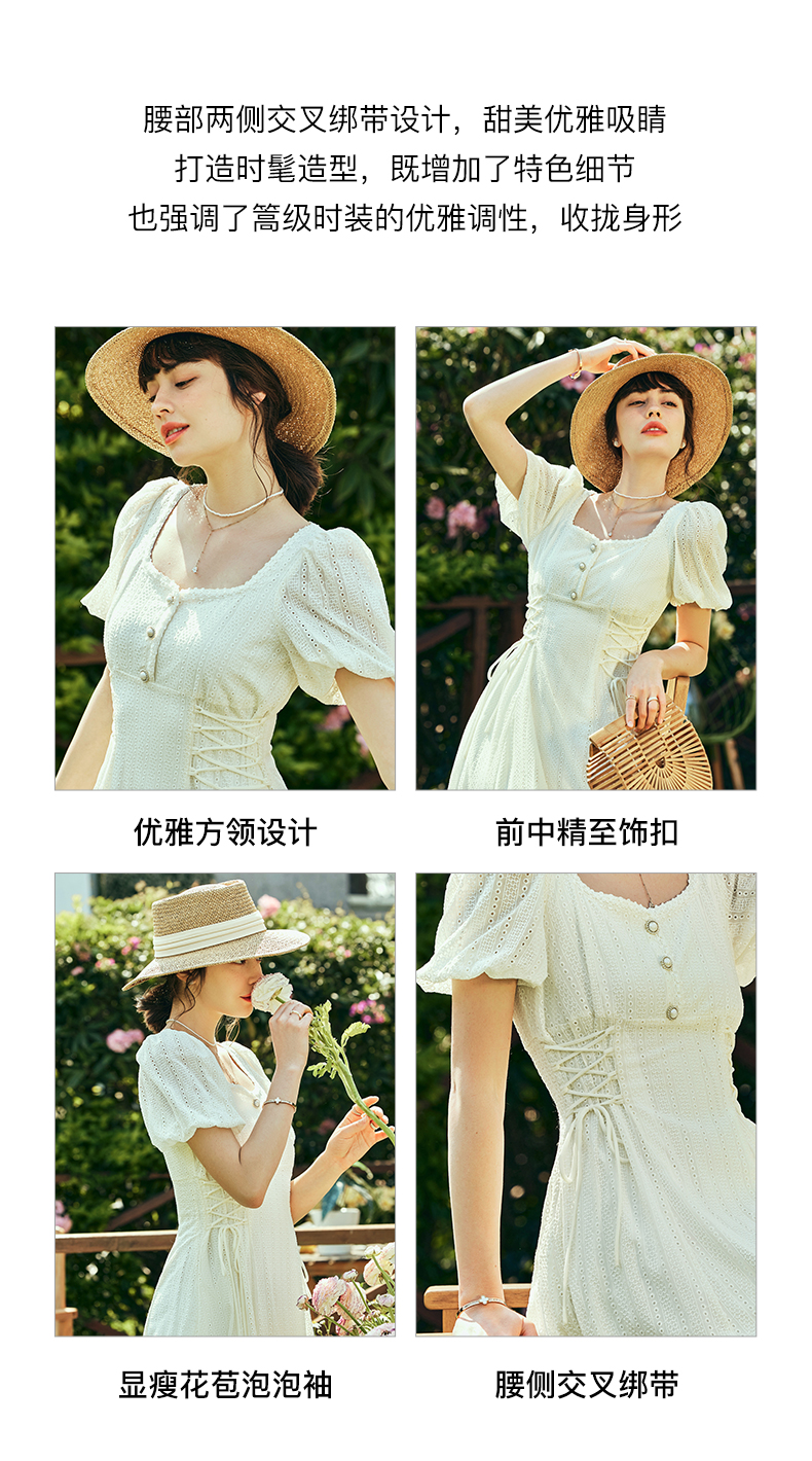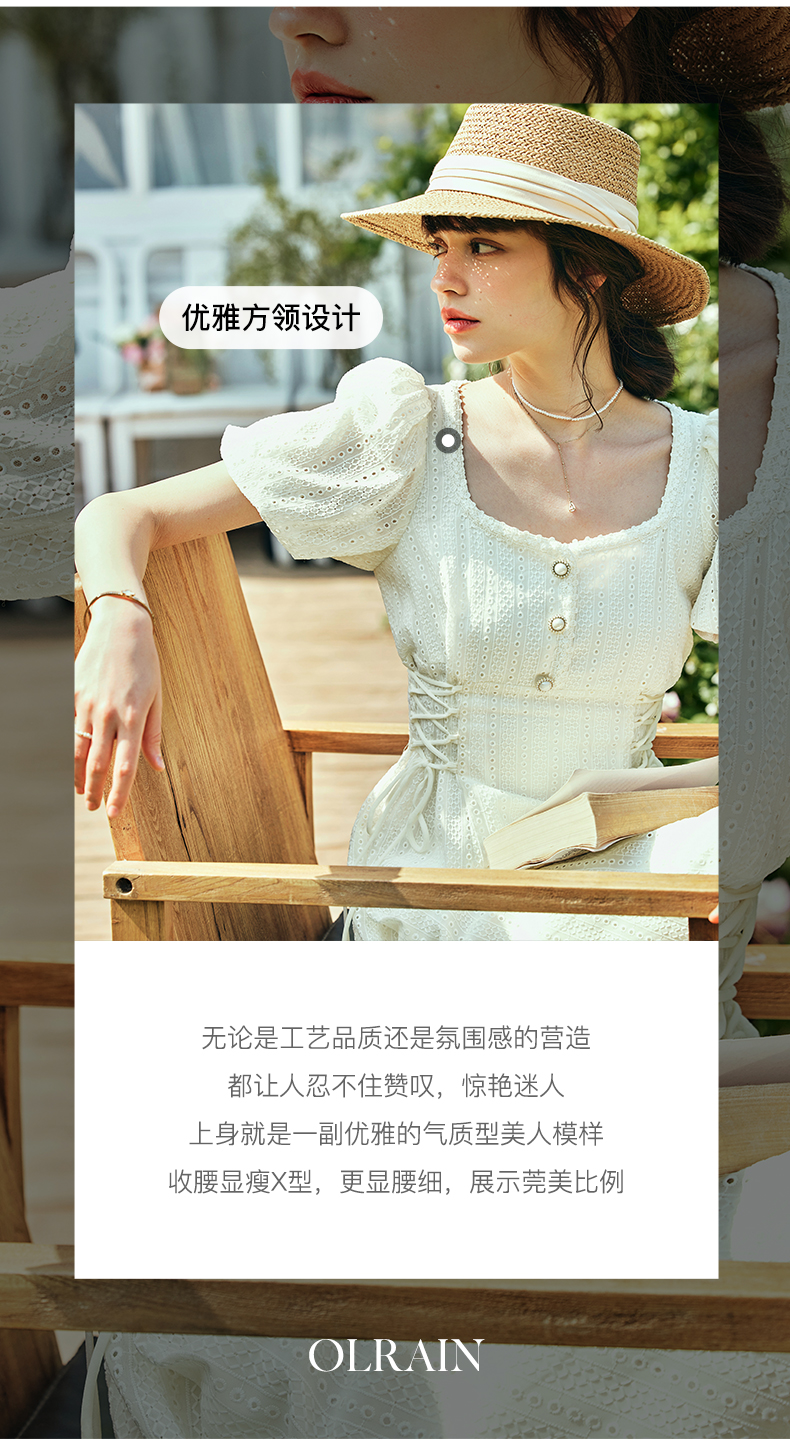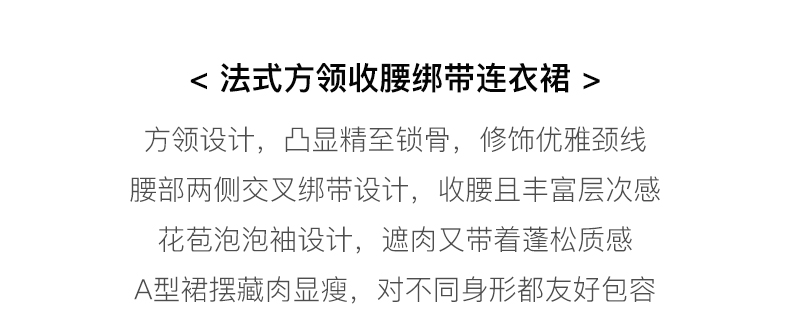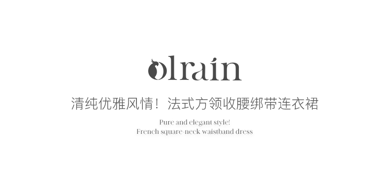 OLrain欧芮儿法式方领连衣裙女夏季2023年新款收腰系带泡泡袖裙子