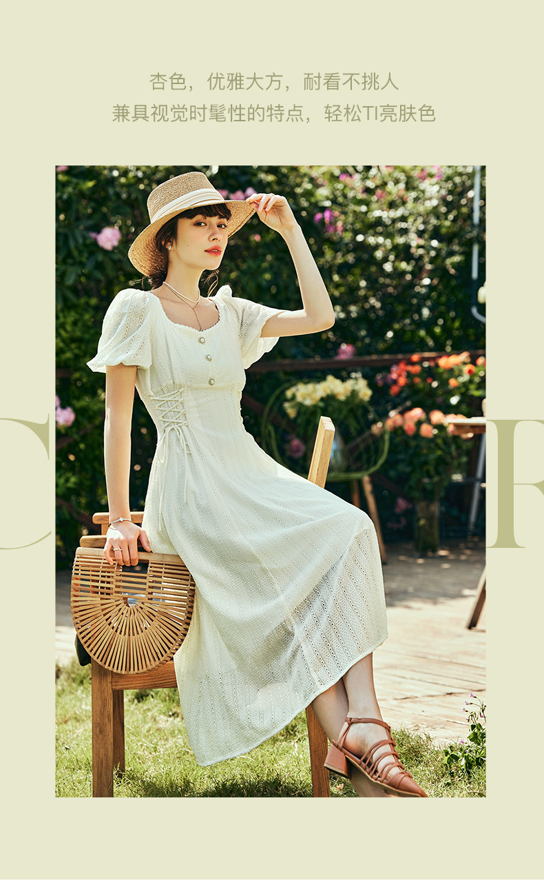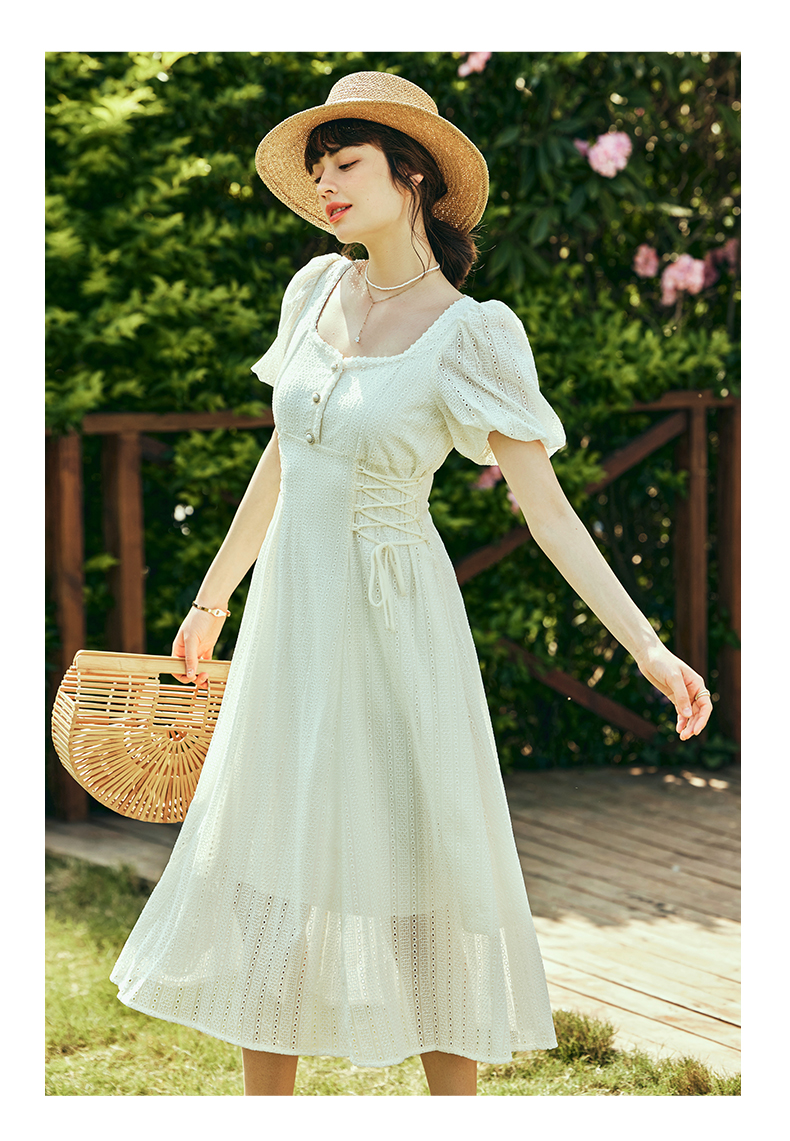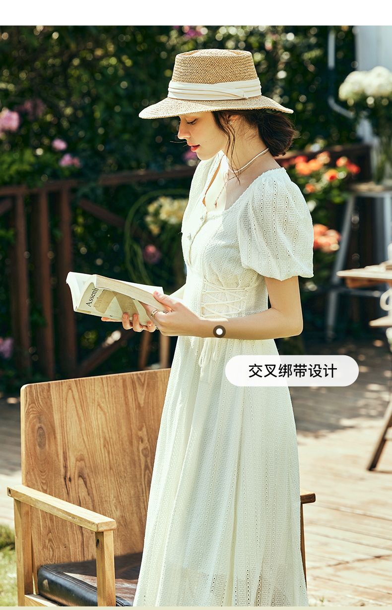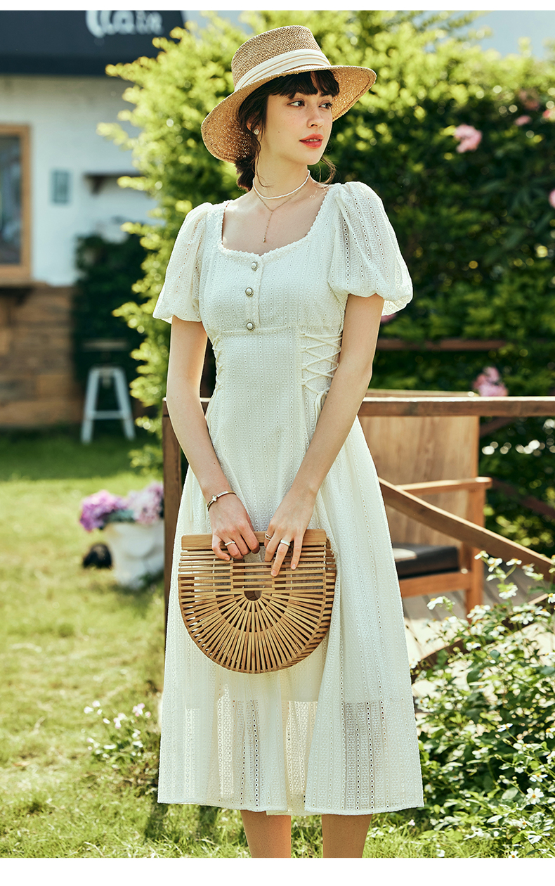 OLrain欧芮儿法式方领连衣裙女夏季2023年新款收腰系带泡泡袖裙子
