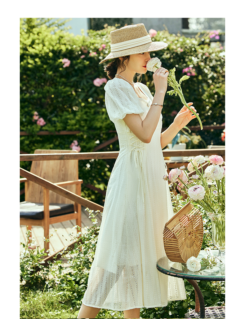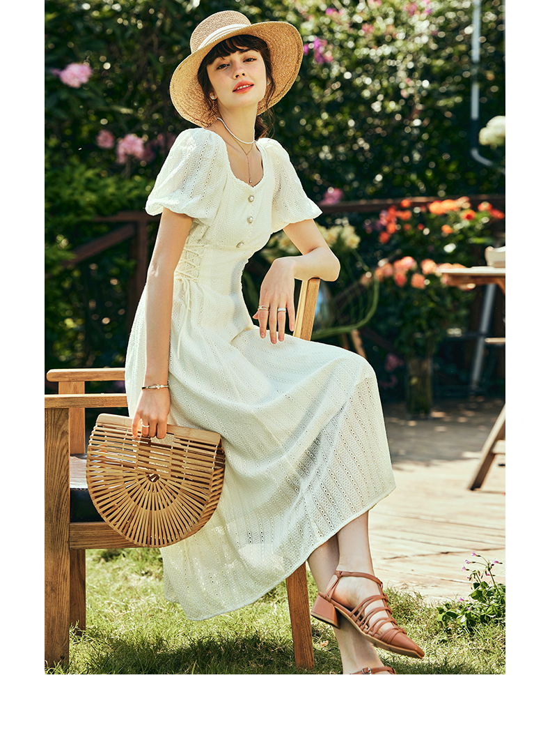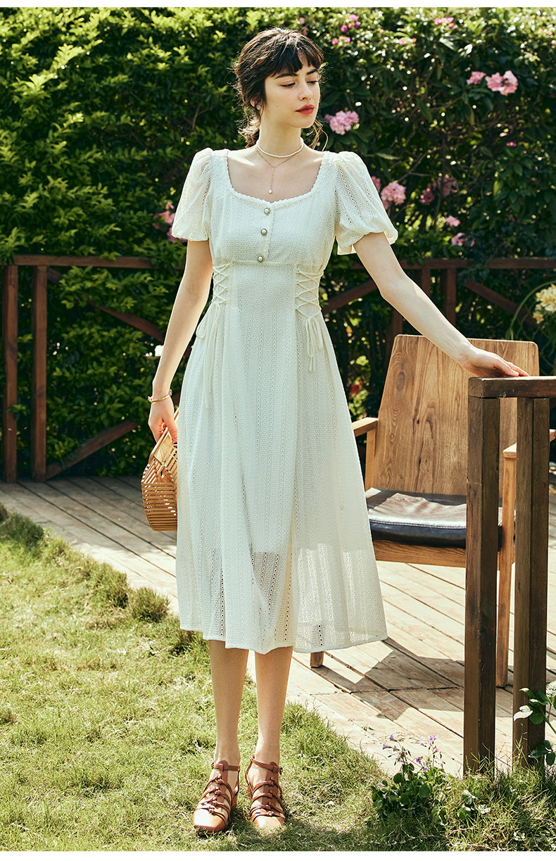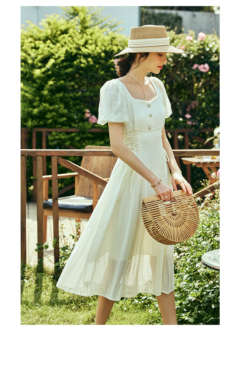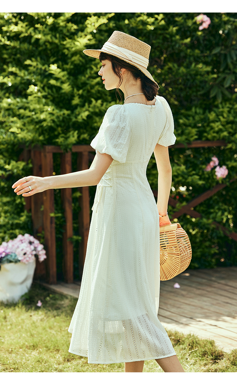 OLrain欧芮儿法式方领连衣裙女夏季2023年新款收腰系带泡泡袖裙子