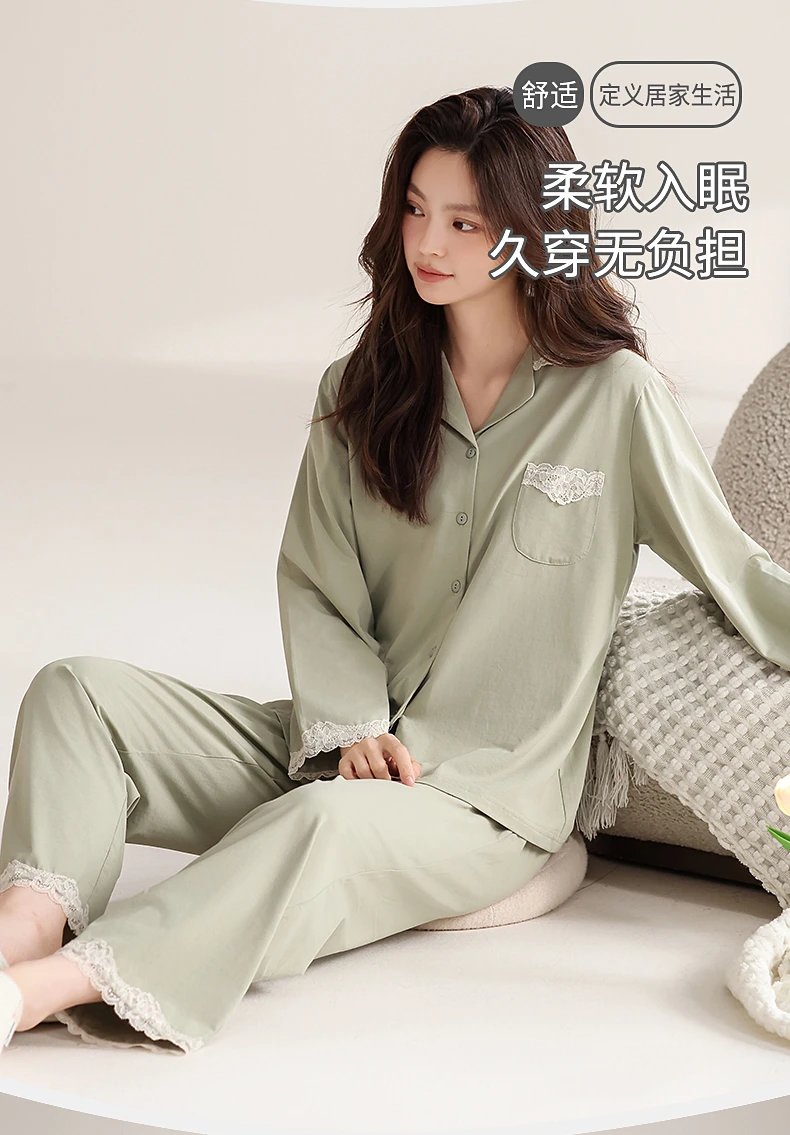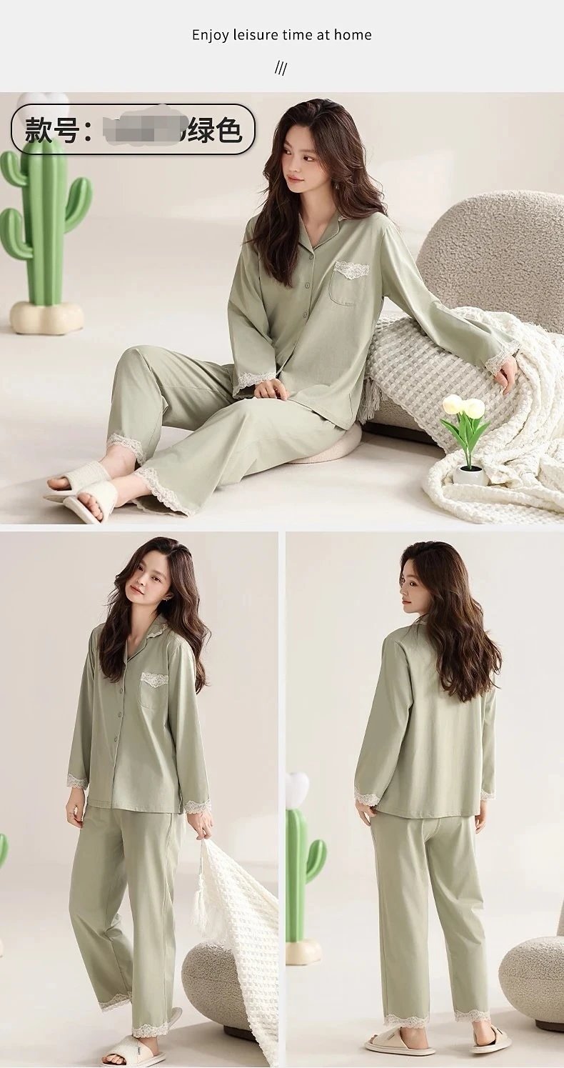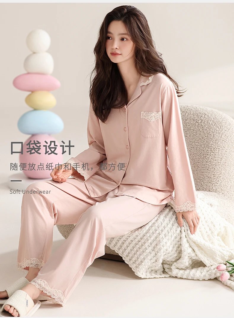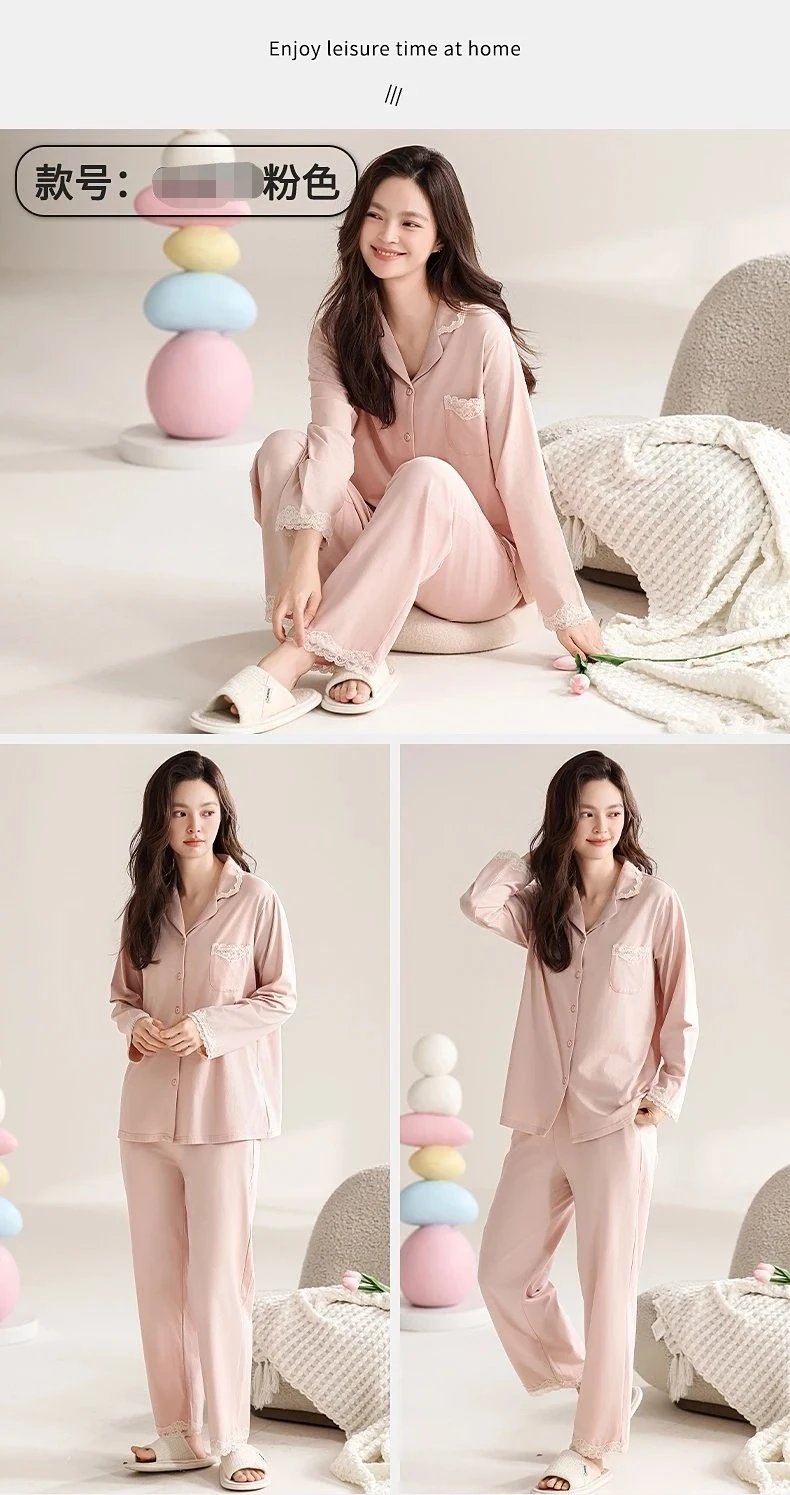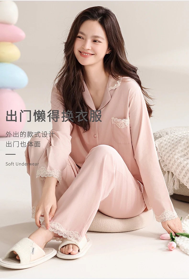线下实体版【品质好货】 女士蕾丝软弹纯棉家居服睡衣,长袖+长裤