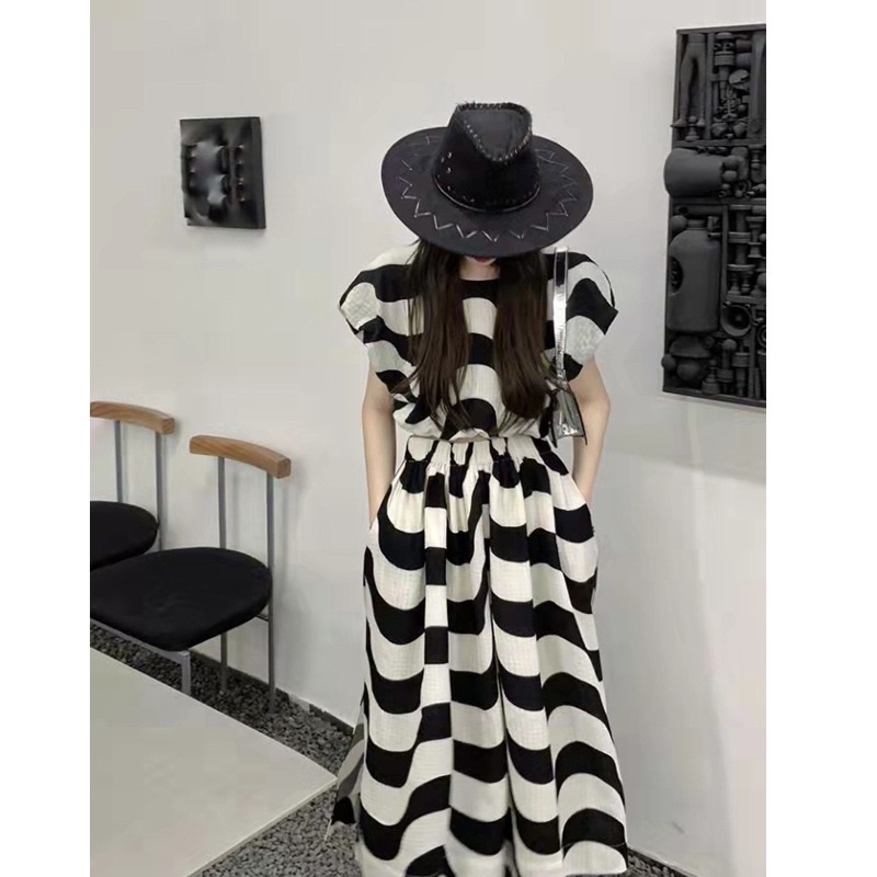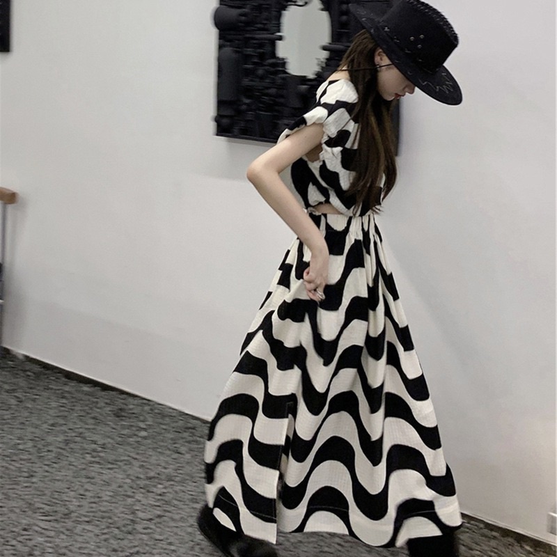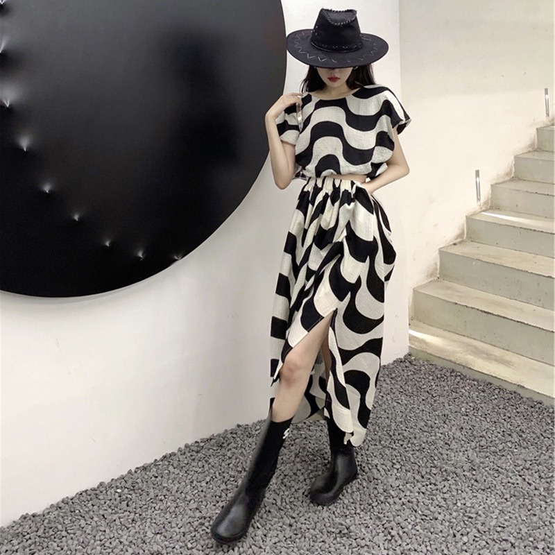 (清仓现货)【社群供G】时尚设计感撞色波浪纹高级感上衣+高腰开叉半身裙两件套