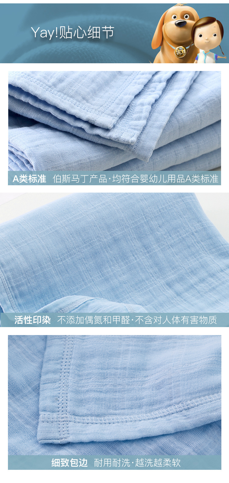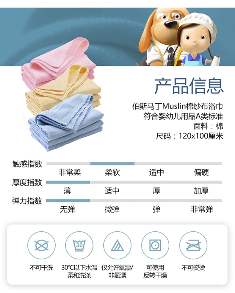 伯斯马丁【A类标准】纱布浴巾1条装 120*100CM