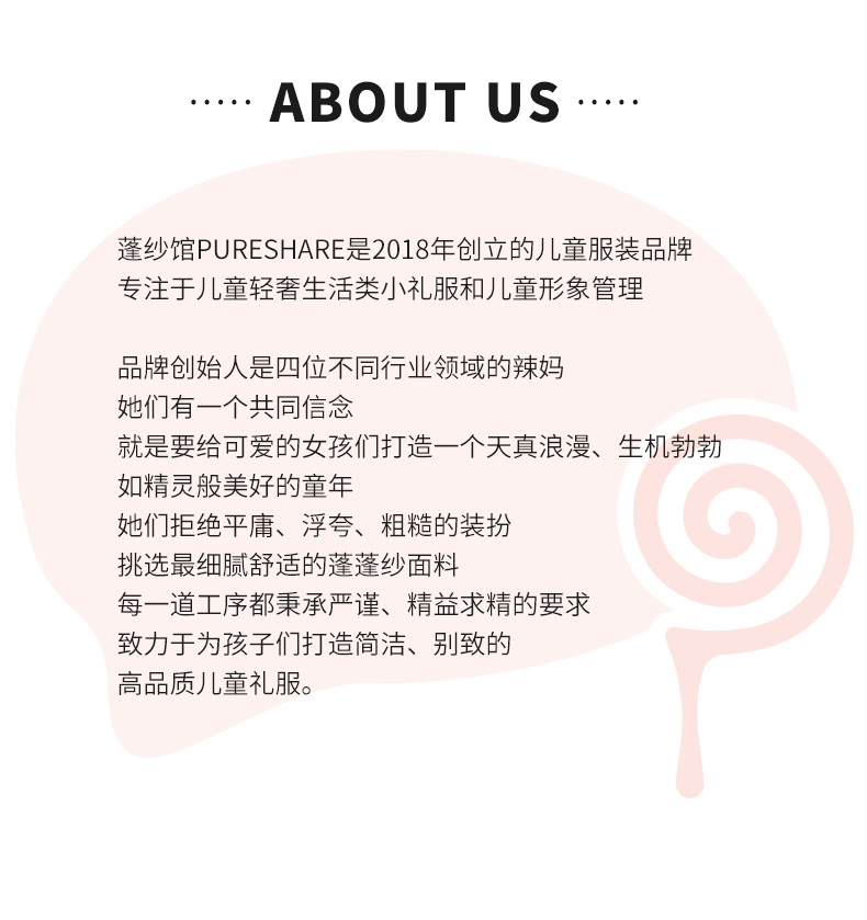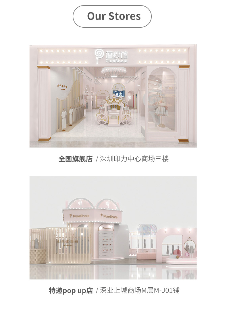 - PureShare蓬纱馆,2018年创立的儿童服装品牌,专注于儿童轻奢生活类小礼服,主张“让孩子做最独特的自己”的品牌理念,为孩子们提供时尚简洁、优雅而又不失童真的生活类礼服。